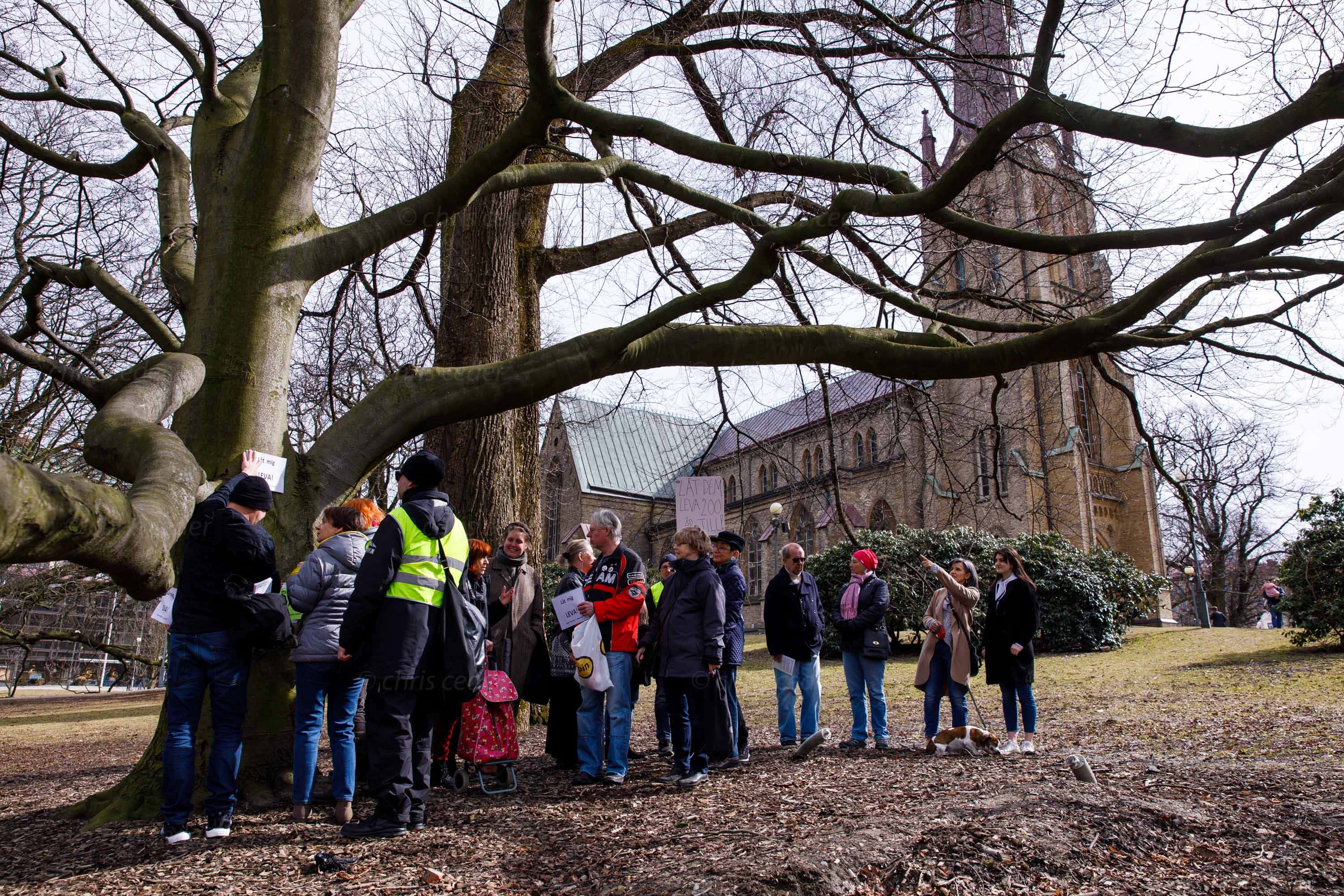 Ett 40-tal aktivister slöt upp i kampen mot Västlänken och satte upp band och lappar på träden med budskapet “Låt mig leva”. Det var folk i alla åldrar som njöt av den första vårvärmen och solskenet under några av stadens mest fantastiska träd!