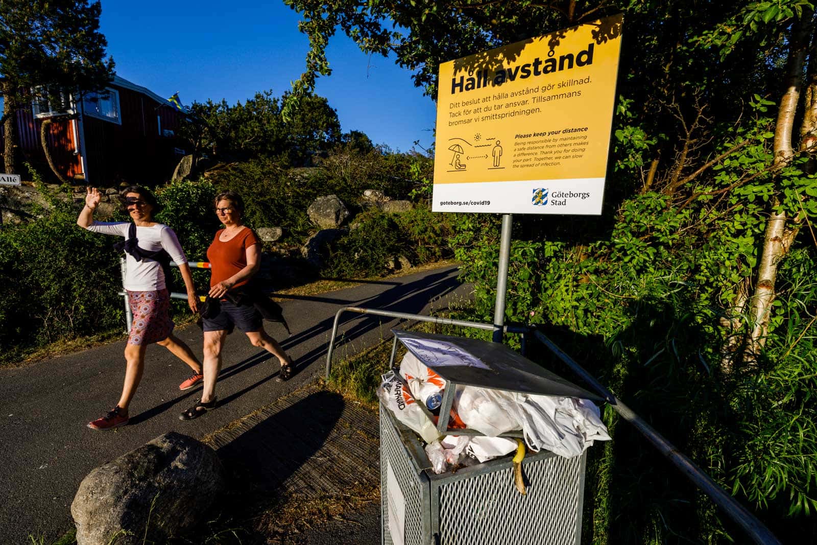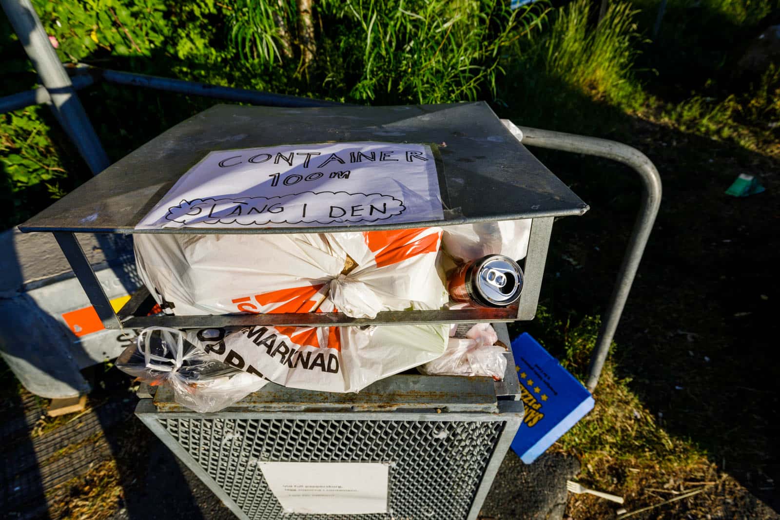 När jag stod där slängde flera personer ner skräp i den dyra Big Belly-tunnan trots att den har mist sin svälgförmåga, överväldigad av allt skräp folk pressar i tron om att den är bottenlös. Nåväl, inte lätt att läsa skyltar när man tillbringat en dag i bländande sol och glittrande reflektioner. Sophögen från häromveckan är dessbättre inte kvar, men en ny är inte långt borta med den ena soptunnan ur funktion och den andra full till bristningsgränsen, precis som nästa närmaste soptunna, på parkeringsplatsen.