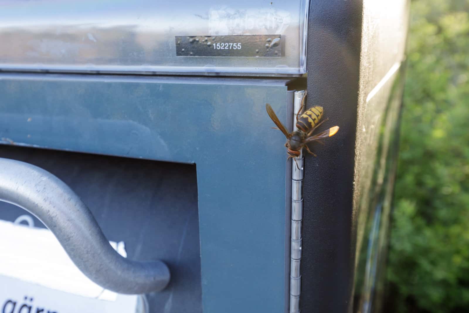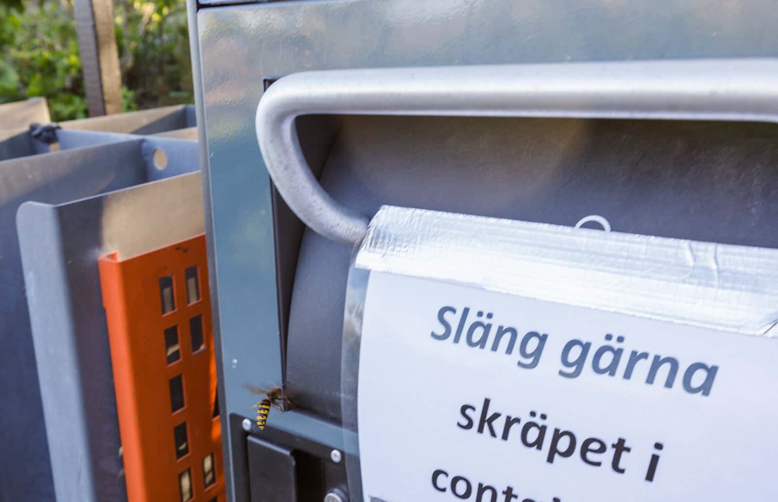 Det var länge sedan jag såg en bålgeting. Och när jag plötsligt får se detta fascinerande och vackra djur så är det en sorglig syn, den stackars insekten försöker ta sig in en av Göteborgs smarta soptunnor på Smithska udden.