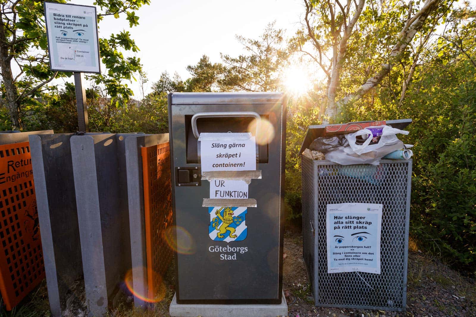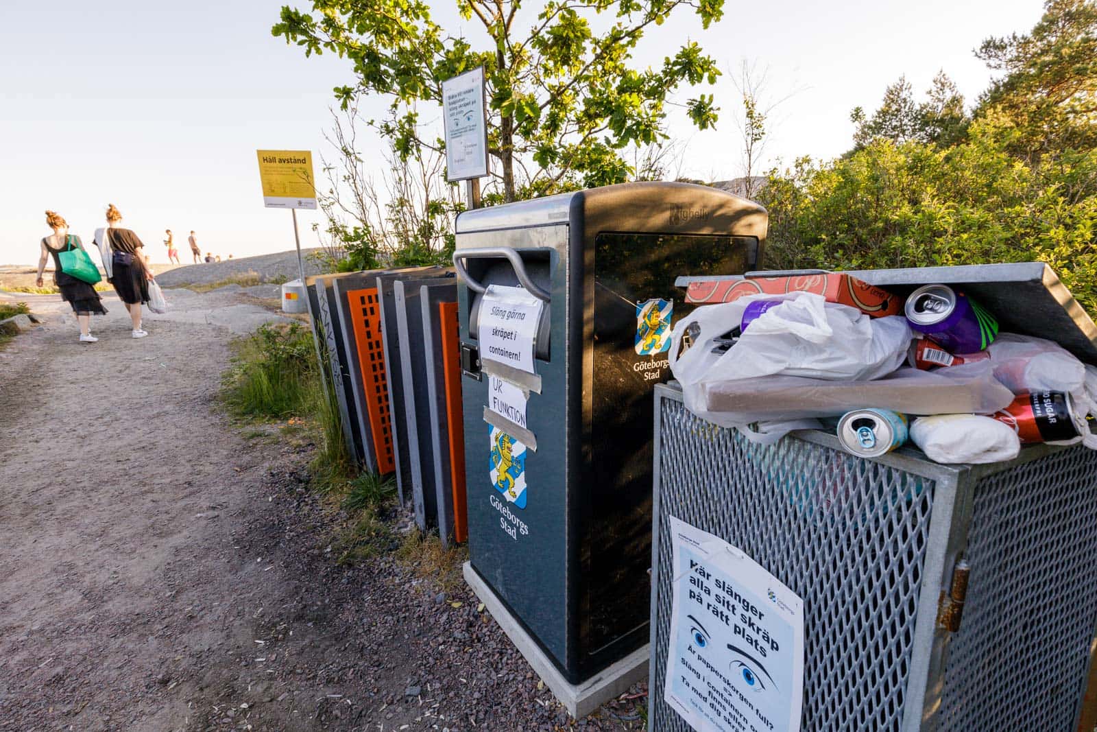 Den “smarta” solenergidrivna Big Belly-tunnan som utlovar att kunna svälja fyra gånger mer sopor än en vanlig soptunna är återigen ur funktion. Det finns nu bara en fungerande tunna på denna oerhört välbesökta badplats – och den är som vanligt överfull när jag besöker platsen efter en dag med badväder. Bredvid står två stora behållare för förbrukade engångsgrillar som gapar tomma. Vid mitt senaste besök den andra juni var Big Belly-tunnan också ur funktion. En svart sopsäck var då knuten runt den defekta tunnan för att spärra inkastet.