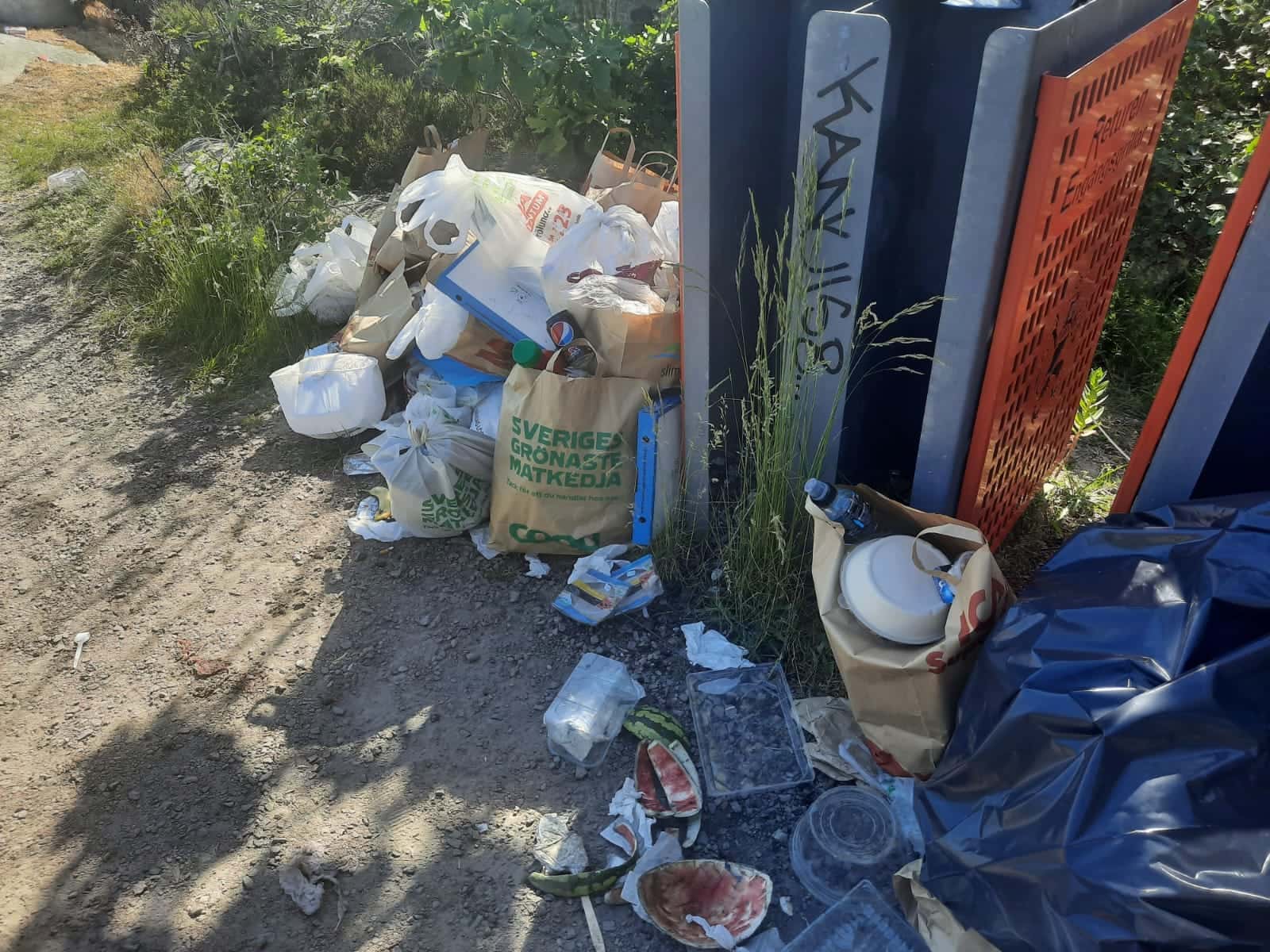 När jag besökte platsen i måndags kväll, den 16 juni var den vämjeliga sophögen tack och lov borta men de totalt två fungerande soptunnorna – en på den jättestora parkeringen och en ute på udden – var så knökfulla att folk återigen börjat lägga skräp på marken bredvid tunnorna. På ett anslag som sitter på soptunnan vid badplatsen står det: “Är soptunnan full? Släng i containern om det finns eller ta med dig skräpet hem”, utan att tala om var containern står. Undangömd i tät skog 300 meter därifrån. På ett likadant anslag som sitter på en nytillkommen stolpe bakom behållarna för engångsgrillar har en svårbegriplig urblekt karta klistrats på på anslaget.