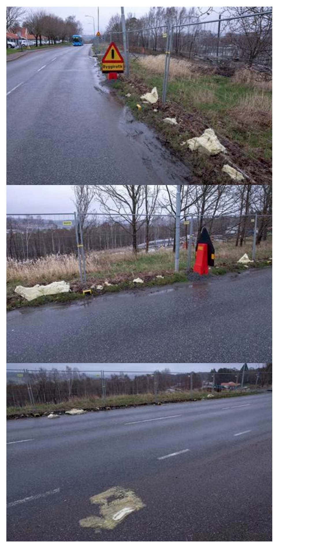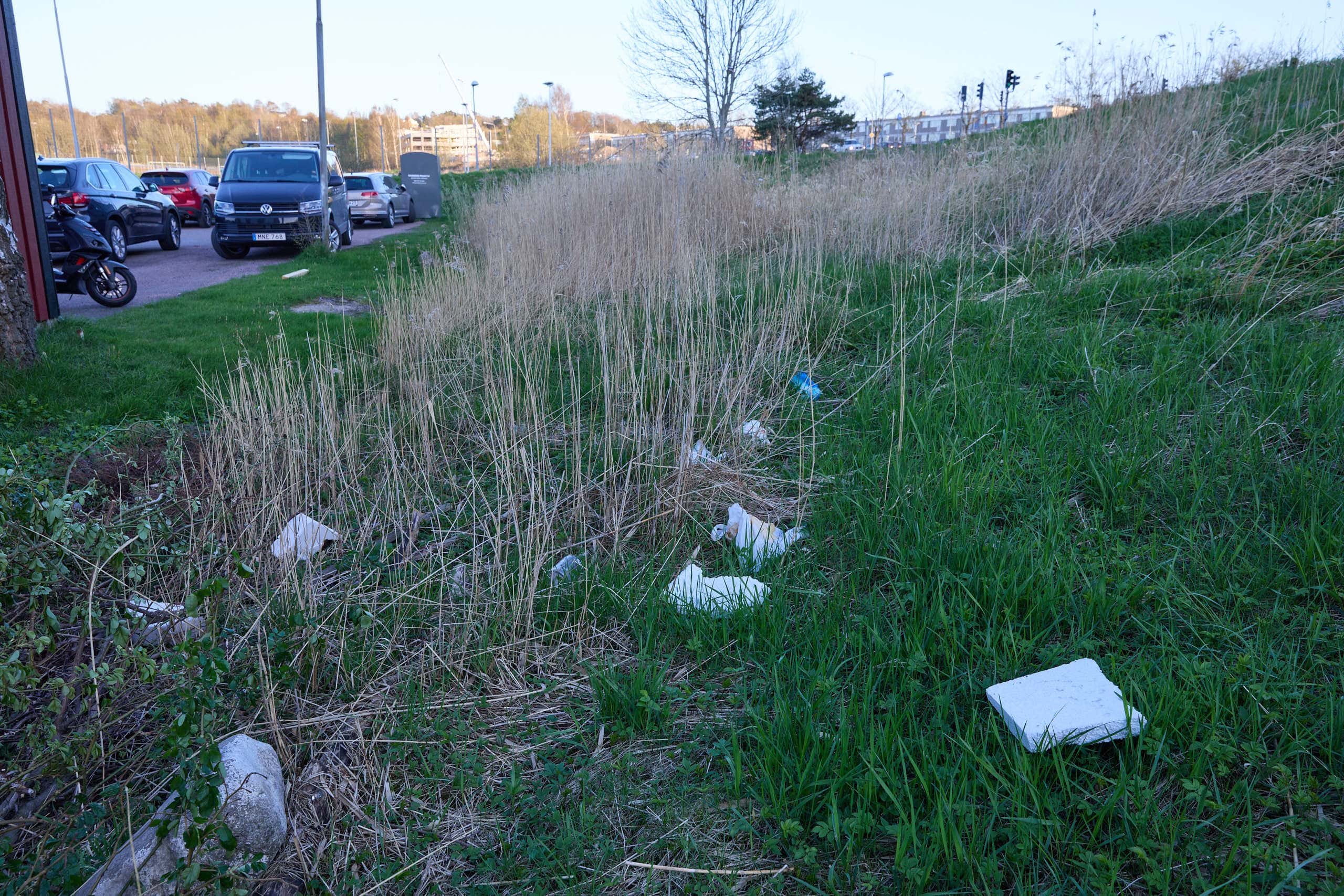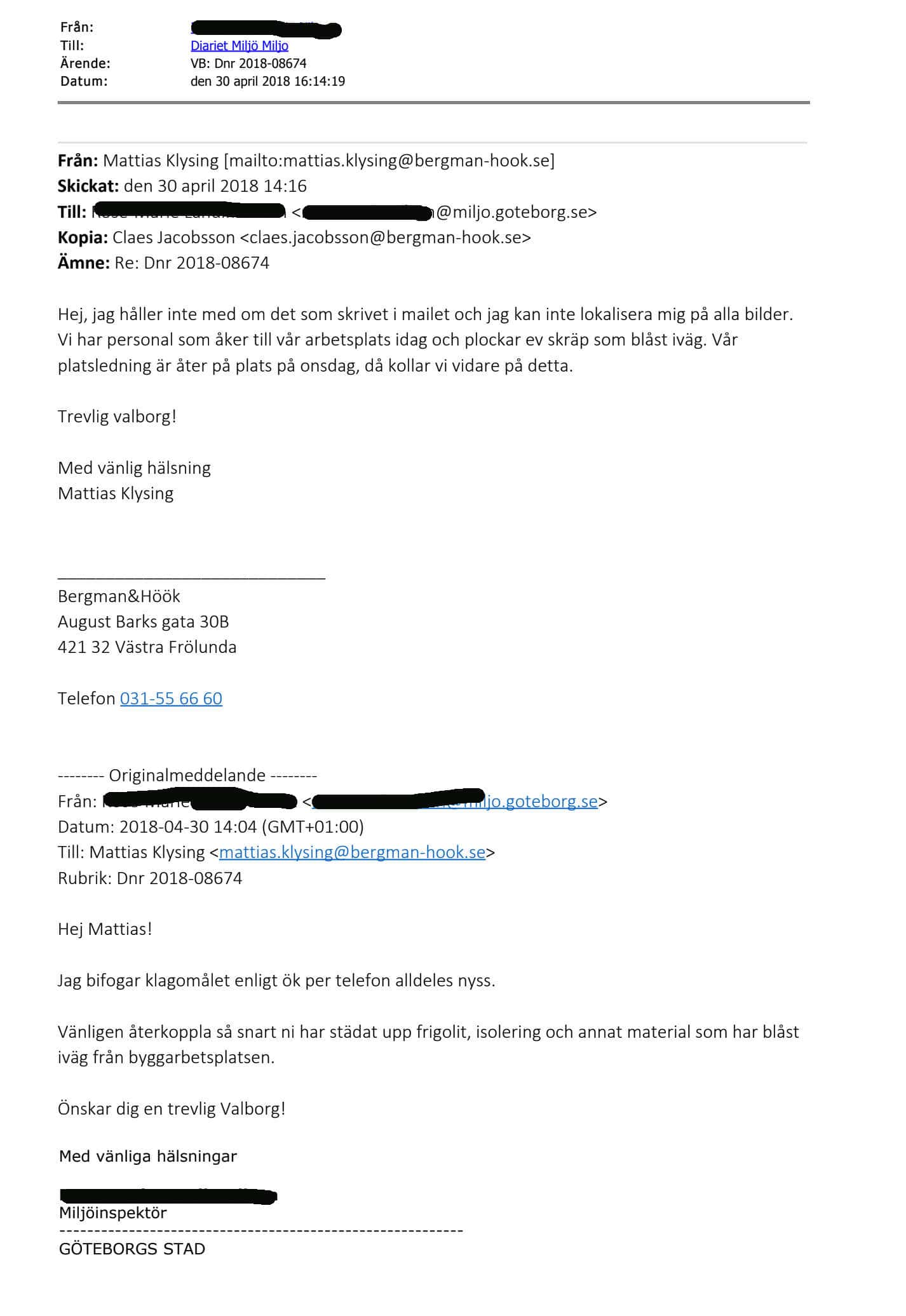 Miljöinspektören önskade VD:n “Trevlig Valborg!” tillbaka och informerade mig kort därefter att skräpet från bygget vid Kobbegården var uppstädat! Var det? Nej, inte alls! Två veckor senare gjorde jag en egen efterkontroll/tillsyn eftersom Miljöförvaltningen alltså inte gör någon. Och som jag anade: all isolering låg kvar utmed Askims Domarringsväg vid bygget i Sisjön och den städning som VD:n Mattias Klysning påstod hade gjorts var så undermåligt utförd att det är ren lögn att ens kalla det för städning. Tre-fyra stycken av de stora frigolitskivorna var borta/uppstädade – det var allt. Alla större avbrutna bitar och småbitar av frigoliten och småbitar och byggplasten låg kvar där den legat när jag fotograferade det, i slänten ner mot Askims IK:s fotbollsplaner. I denna slänt var det över huvud taget inte alls städat – och jag hade noga beskrivit att slänten var nedskräpad från arbetsplatsen i min anmälan till Miljöförvaltningen.
