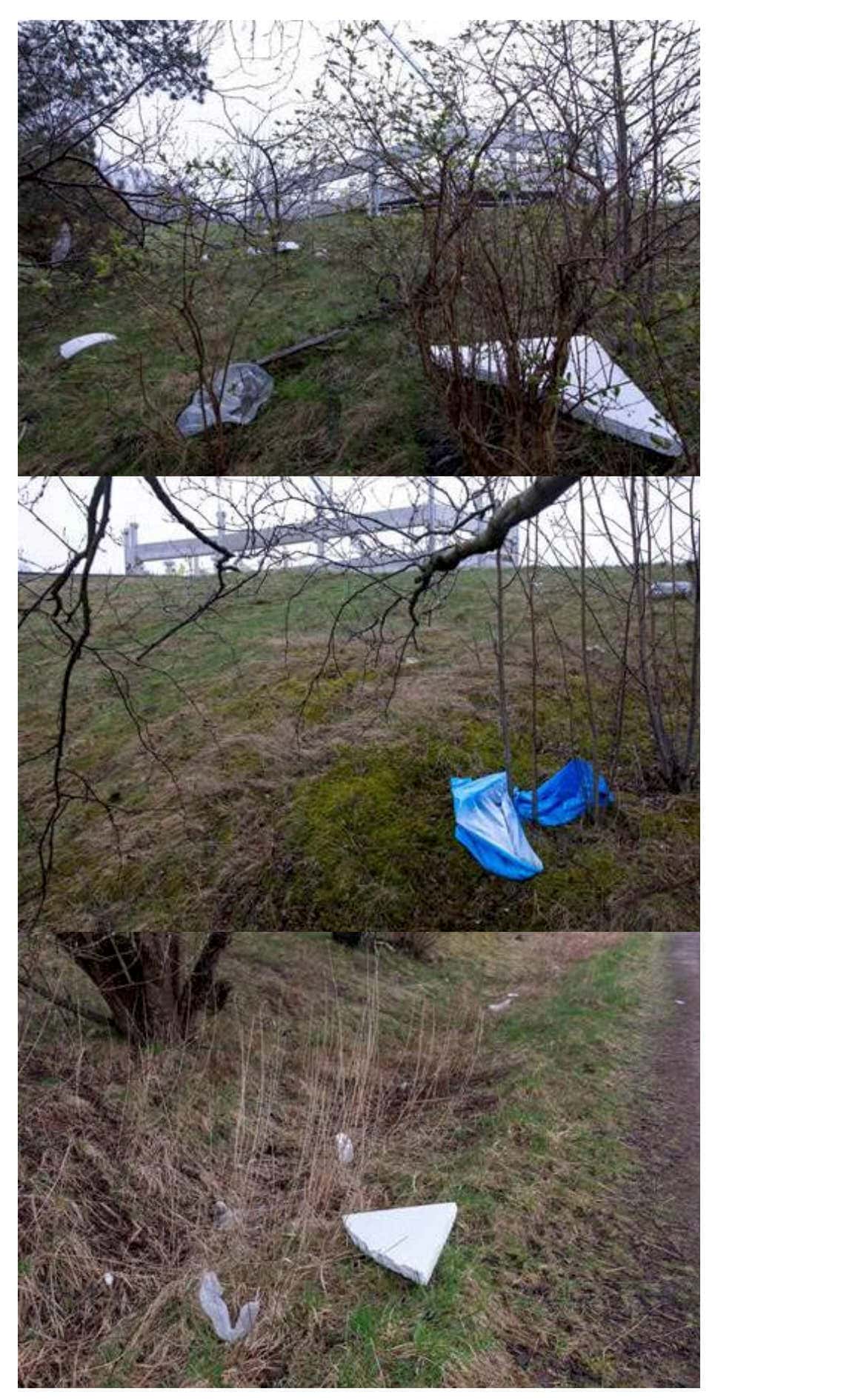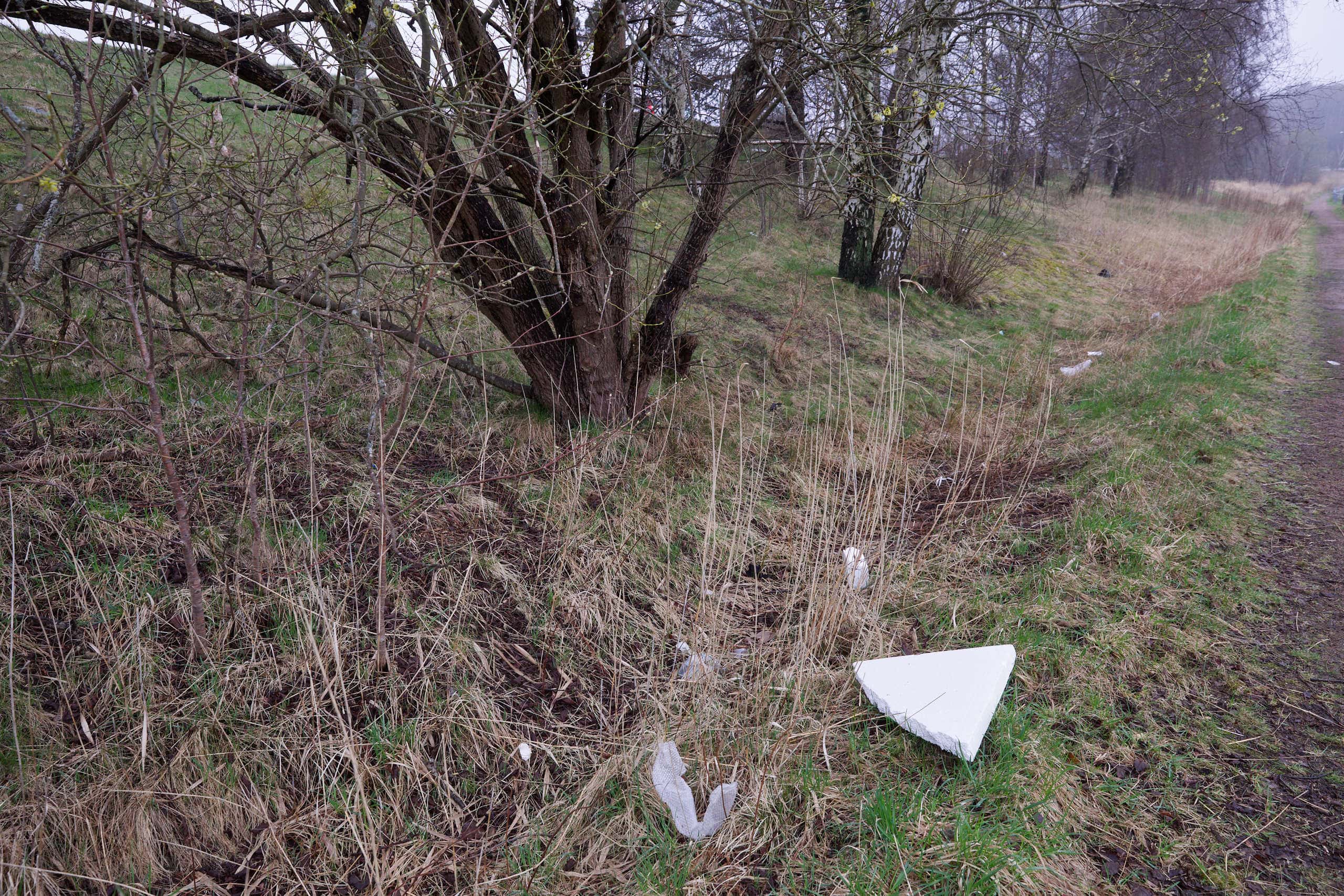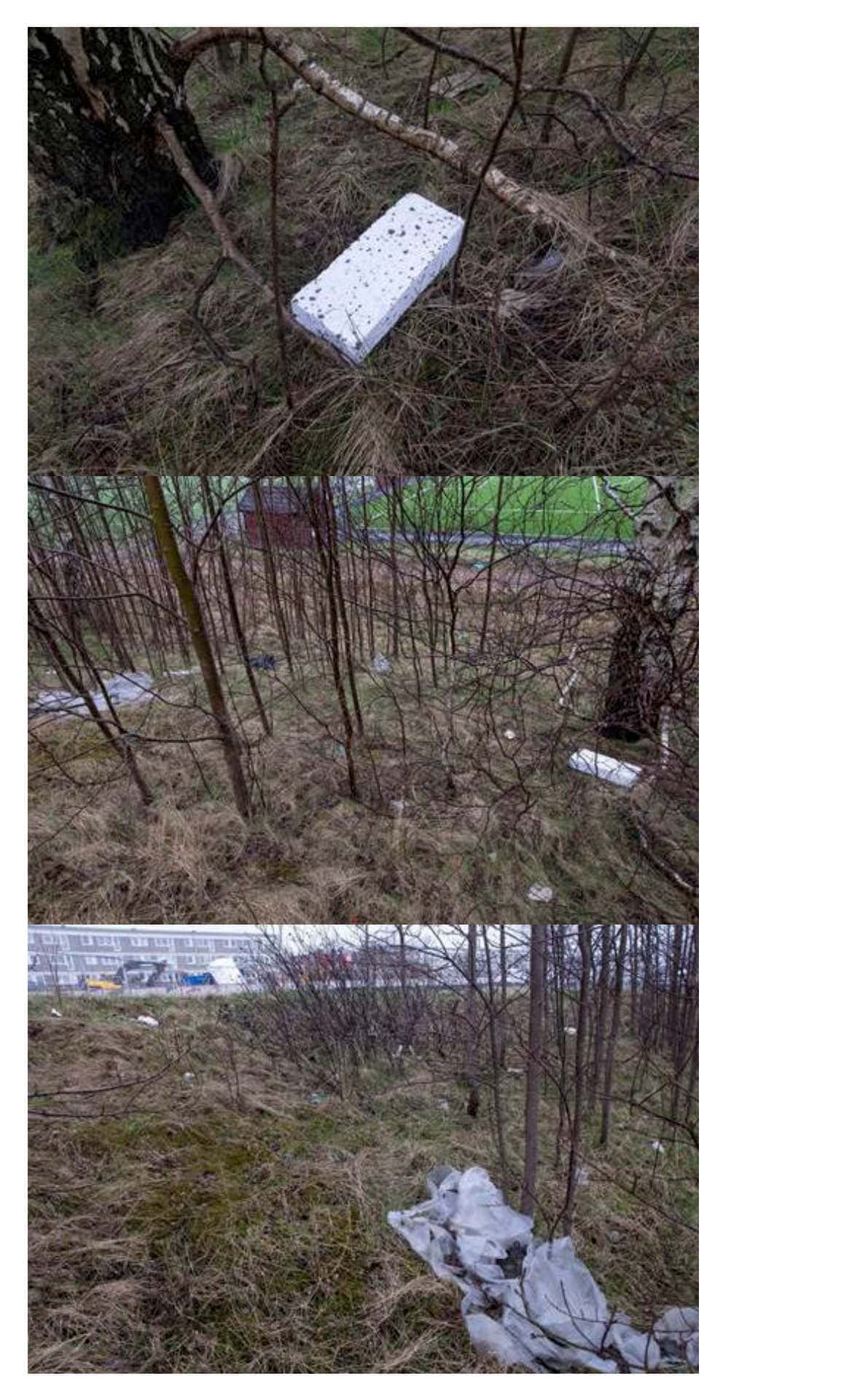 Miljöinspektören önskade VD:n “Trevlig Valborg!” tillbaka och informerade mig kort därefter att skräpet från bygget vid Kobbegården var uppstädat! Var det? Nej, inte alls! Två veckor senare gjorde jag en egen efterkontroll/tillsyn eftersom Miljöförvaltningen alltså inte gör någon. Och som jag anade: all isolering låg kvar utmed Askims Domarringsväg vid bygget i Sisjön och den städning som VD:n Mattias Klysning påstod hade gjorts var så undermåligt utförd att det är ren lögn att ens kalla det för städning. Tre-fyra stycken av de stora frigolitskivorna var borta/uppstädade – det var allt. Alla större avbrutna bitar och småbitar av frigoliten och småbitar och byggplasten låg kvar där den legat när jag fotograferade det, i slänten ner mot Askims IK:s fotbollsplaner. I denna slänt var det över huvud taget inte alls städat – och jag hade noga beskrivit att slänten var nedskräpad från arbetsplatsen i min anmälan till Miljöförvaltningen.