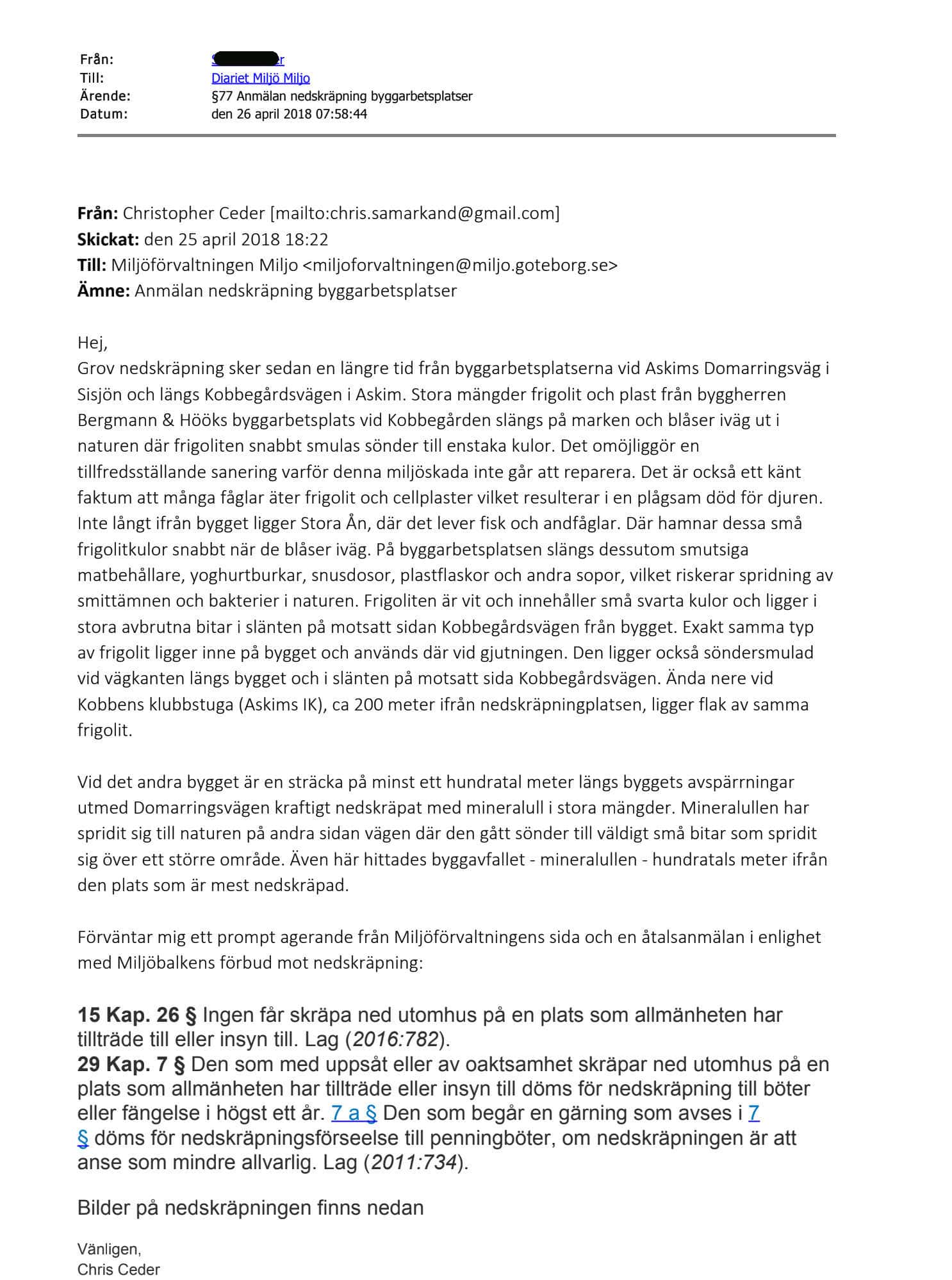 Jag har anmält byggarnas kraftiga nedskräpning i Sisjön och på Kobbegårdsvägen i Askim och skickat in omfattande dokumentation med bildbevis till Miljöförvaltningen Göteborgs Stad. Nedskräpningen är i form av stora mängder frigolit (polystyren = plast, som snabbt smulas sönder i naturen och slits ner till mikroskopiskt små mikroplastpartiklar som hamnar i vattendrag, sjöar och hav, där de tränger in i organismer och deras celler), isolering (mineralull) och byggplast som slängs vind för våg i naturen. Istället för att åka dit på en oanmäld kontroll och “anmäla överträdelser av bestämmelser i miljöbalken eller av föreskrifter som har meddelats med stöd av balken om det finns misstanke om brott” , som den kommunala tillsynsmyndigheten Miljöförvaltningen är skyldig att göra enligt Miljöbalken, förvarnades byggherrarna på Kobbegårdsvägen, Deronne och Bergman & Höök, istället om min anmälan och fick därmed möjlighet att städa upp. Byggherrarna för det stora bostadsbygget i Sisjön kontaktades inte Miljöförvaltningen, som inte heller gjorde någon inspektion i området.