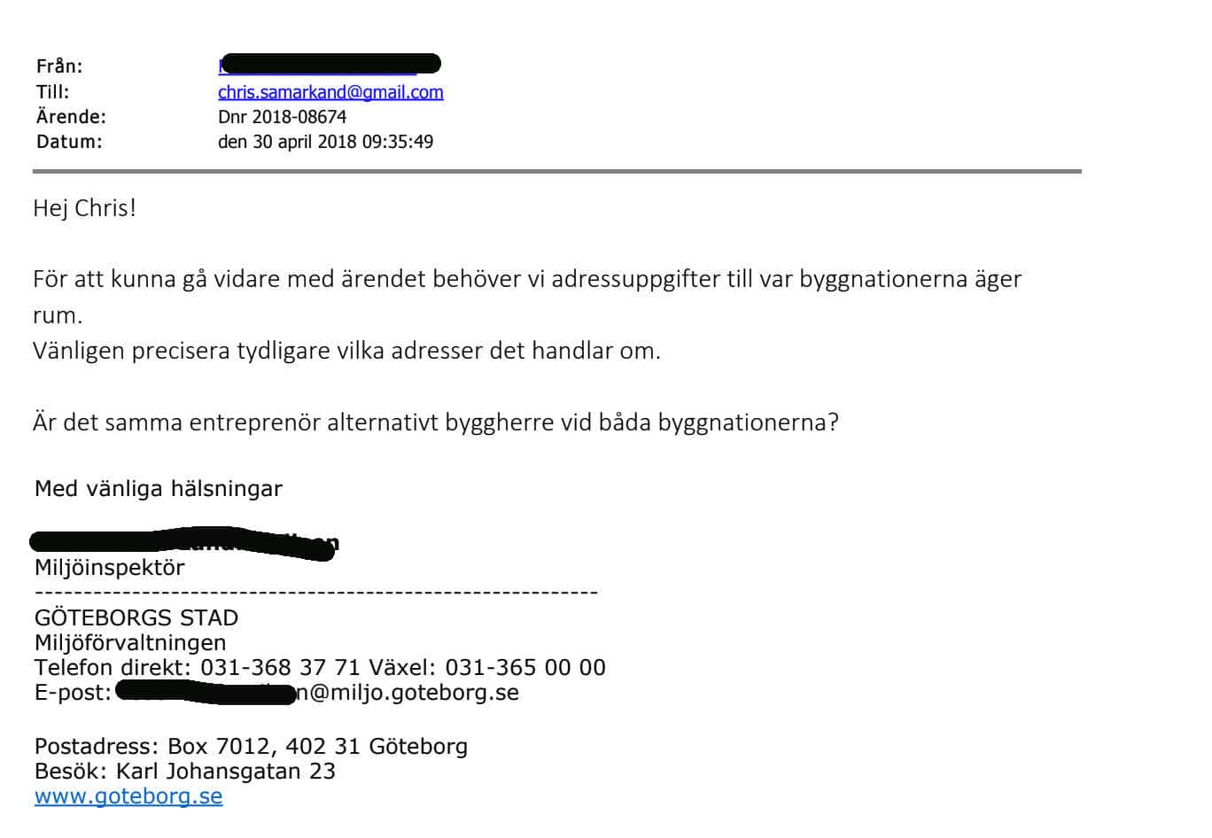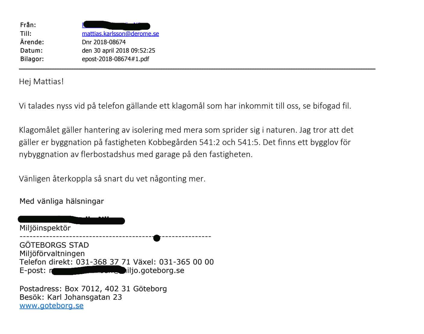 Klysning skriver i mail till Miljöförvaltningens miljöinspektör: