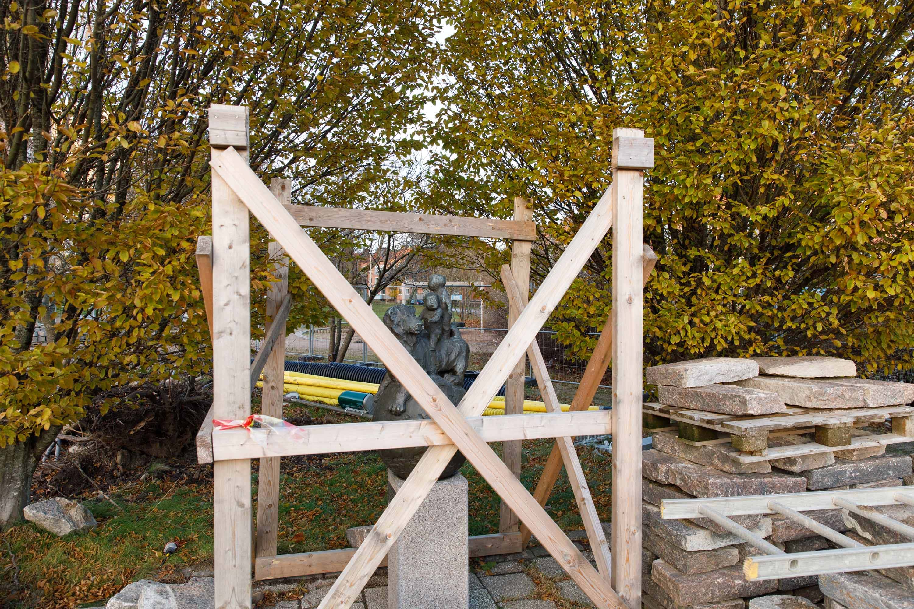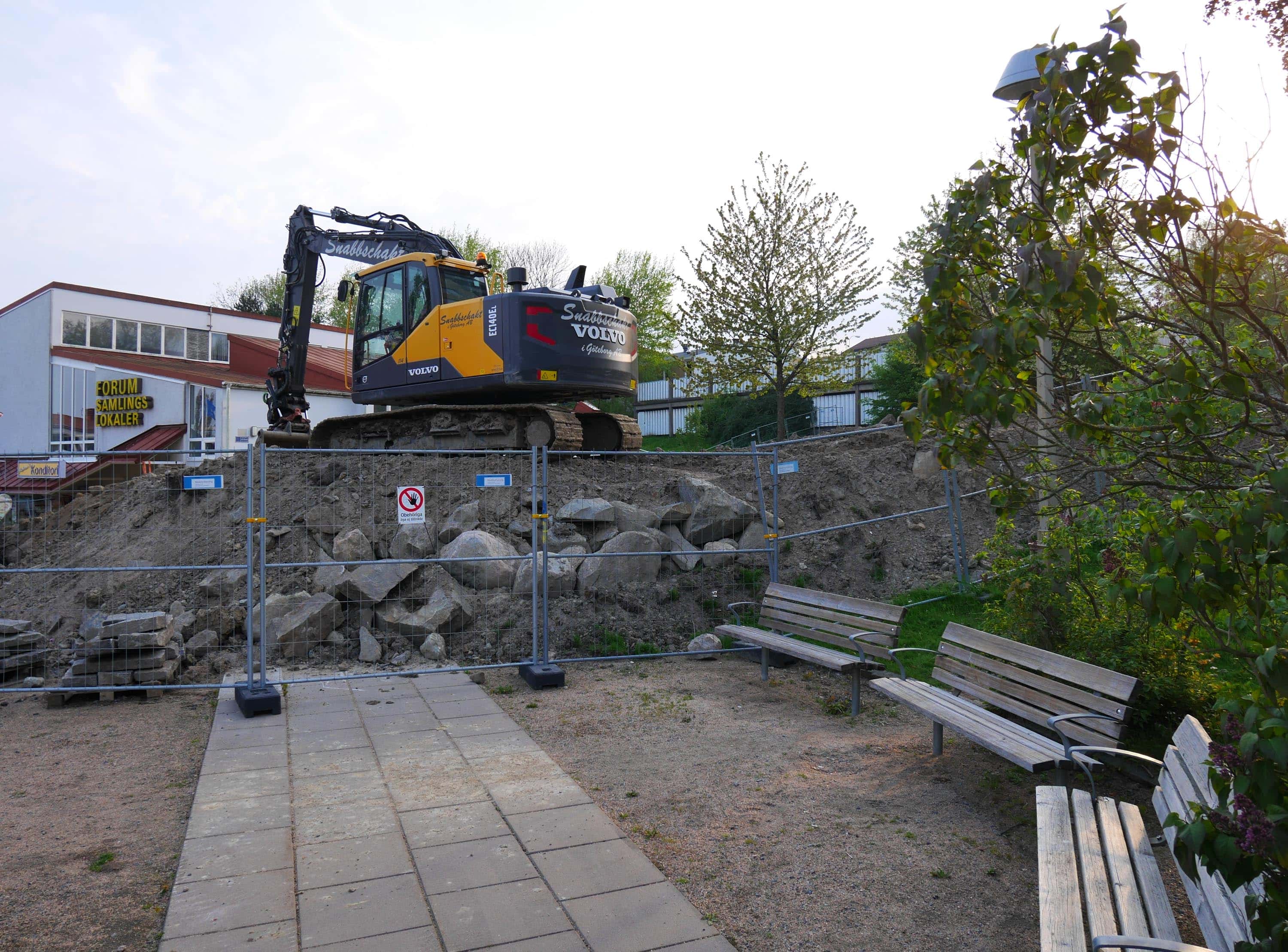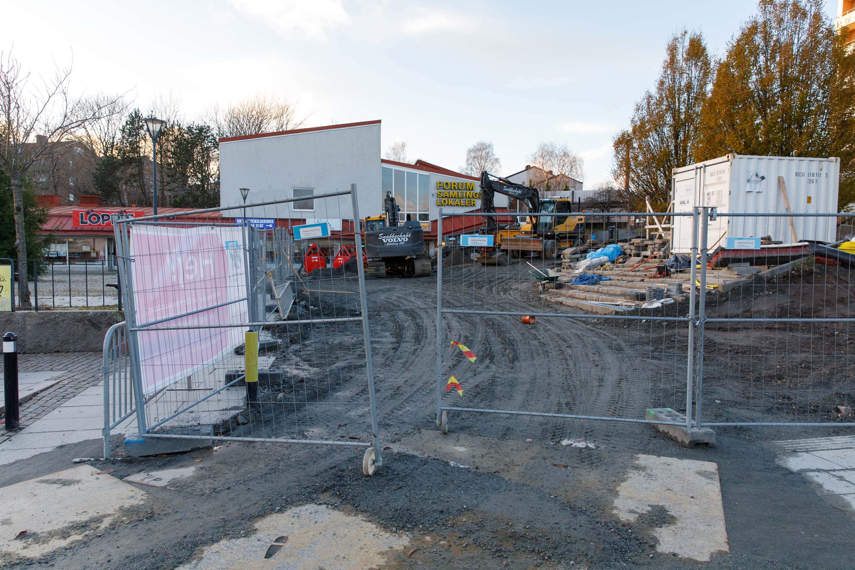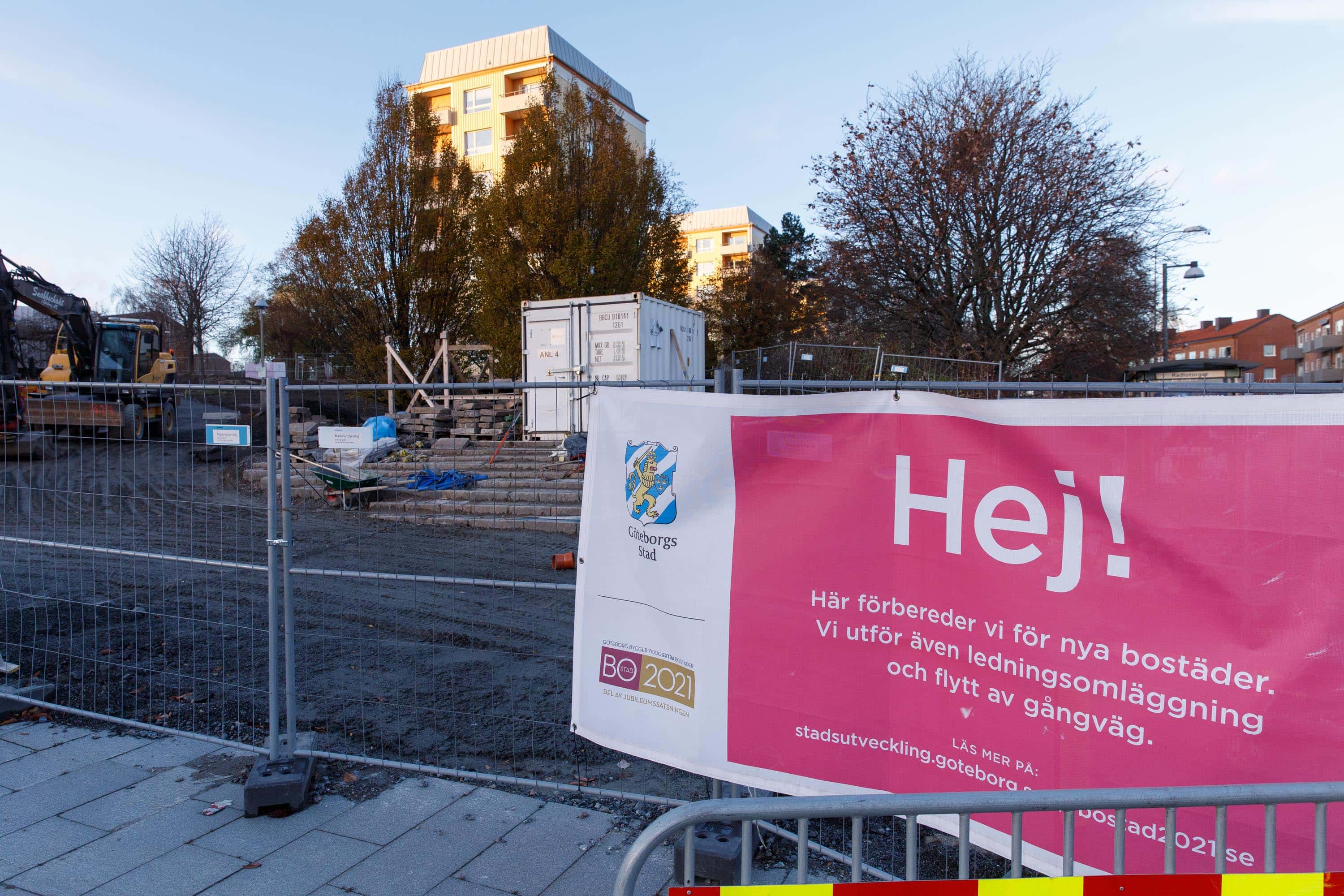 Grinden till arbetsområdet står på vid gavel trots att det är helg och ingen arbetar. På stängslet hänger en pressening med ett jättestort “Hej!” följt av texten “Här förbereder vi för nya bostäder. Vi utför även ledningsomläggning och flytt av gångväg”. Göteborgs Stads Jubileumssatsning 2021″. (Se foto i bildspelet ovan)