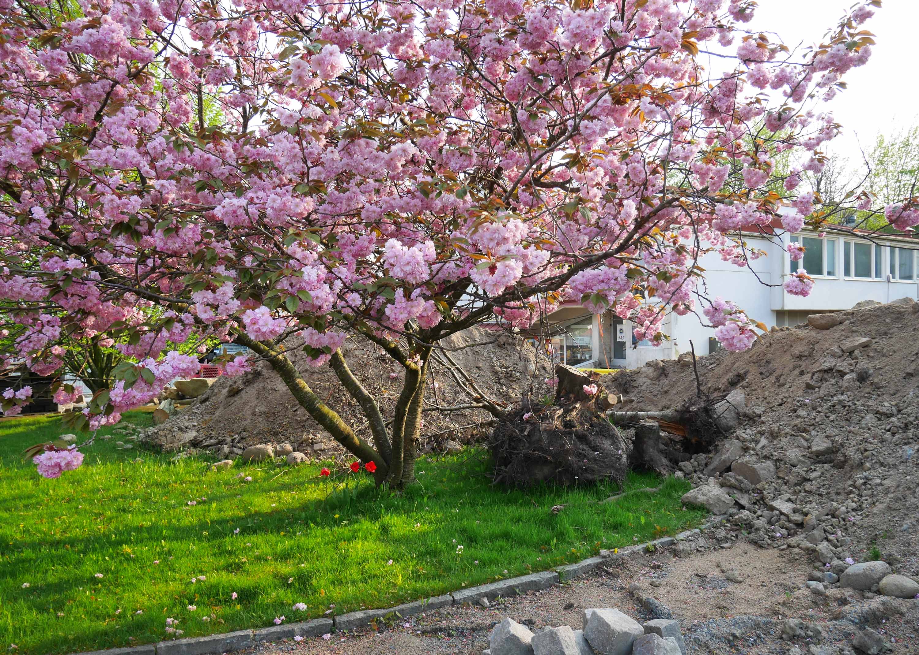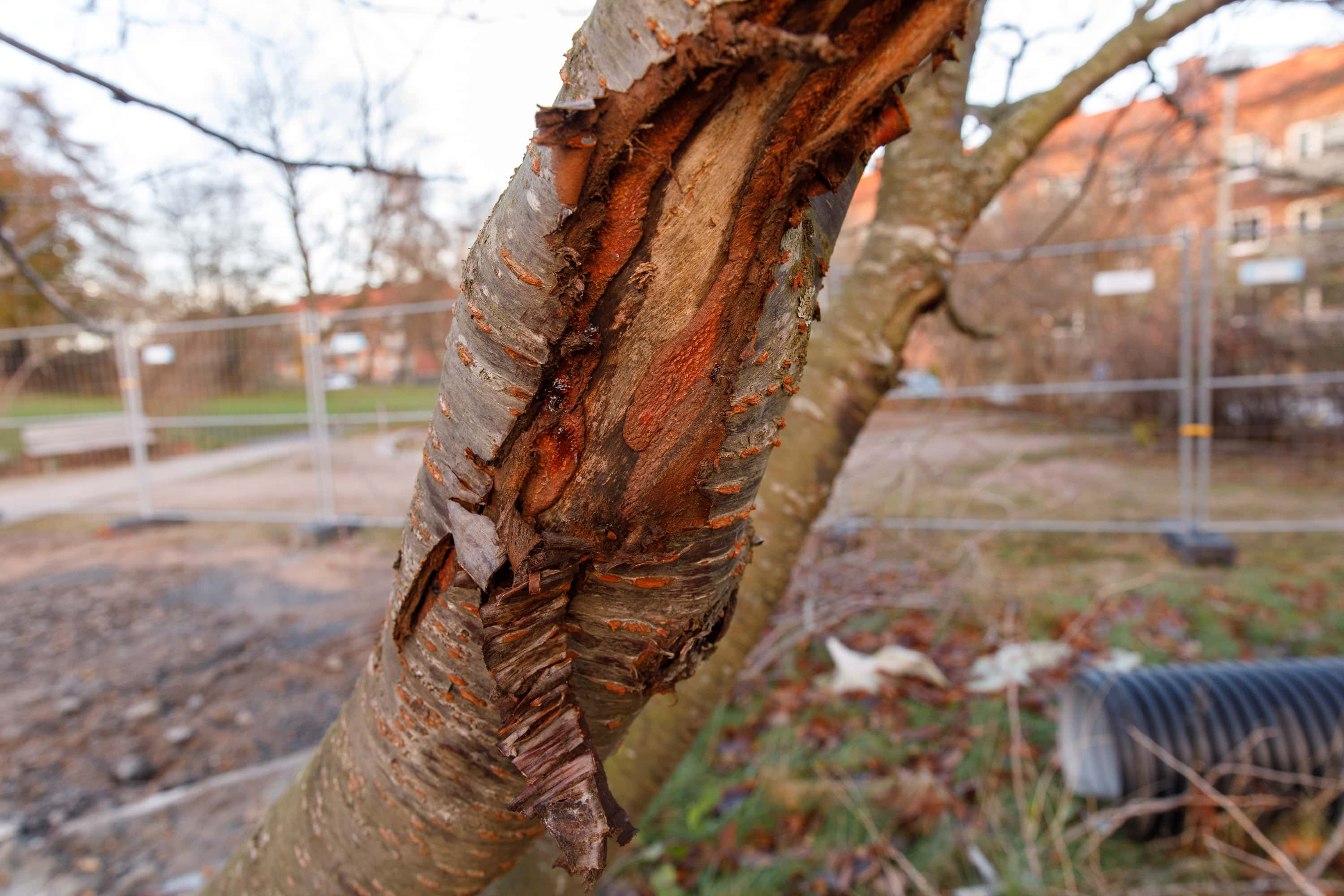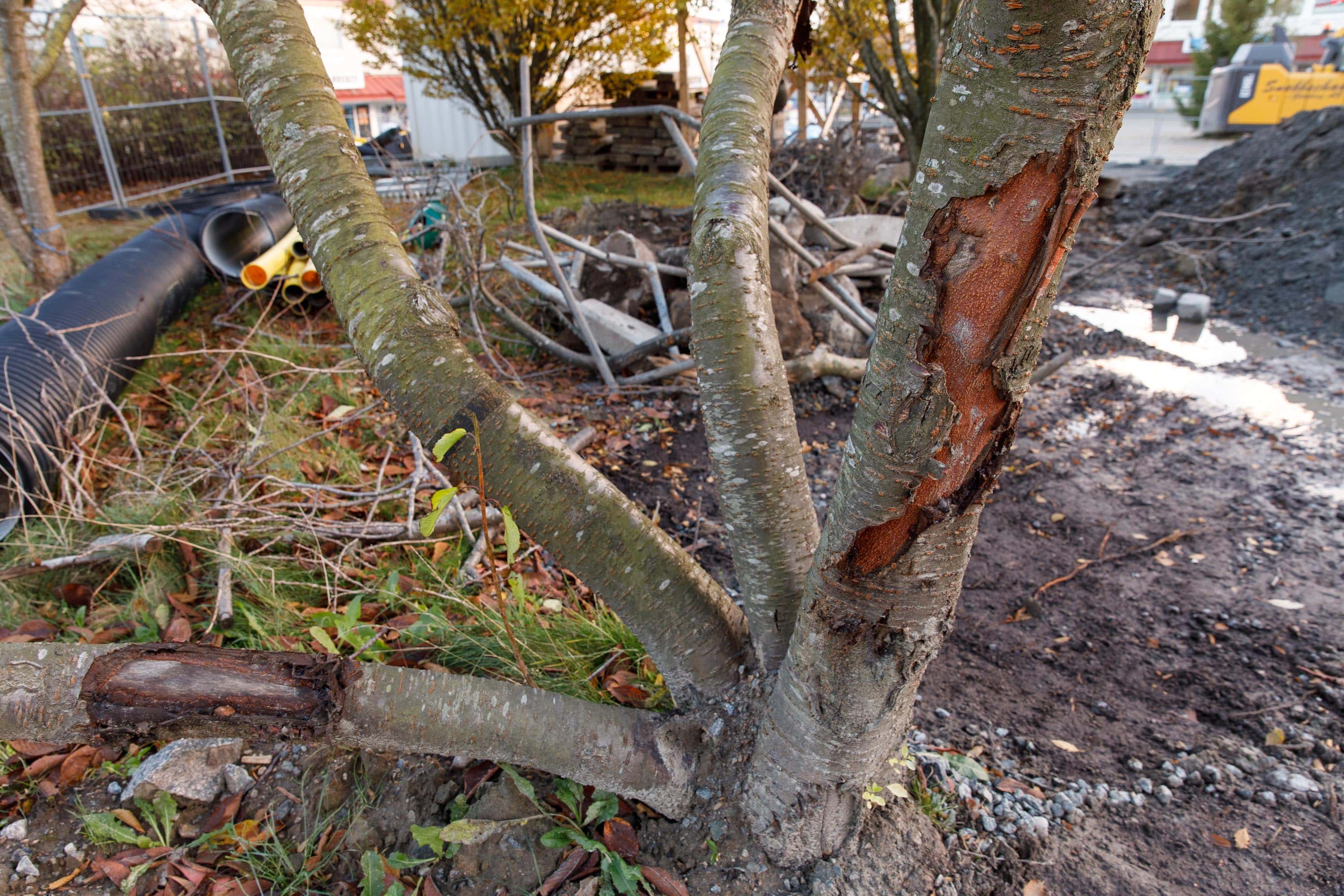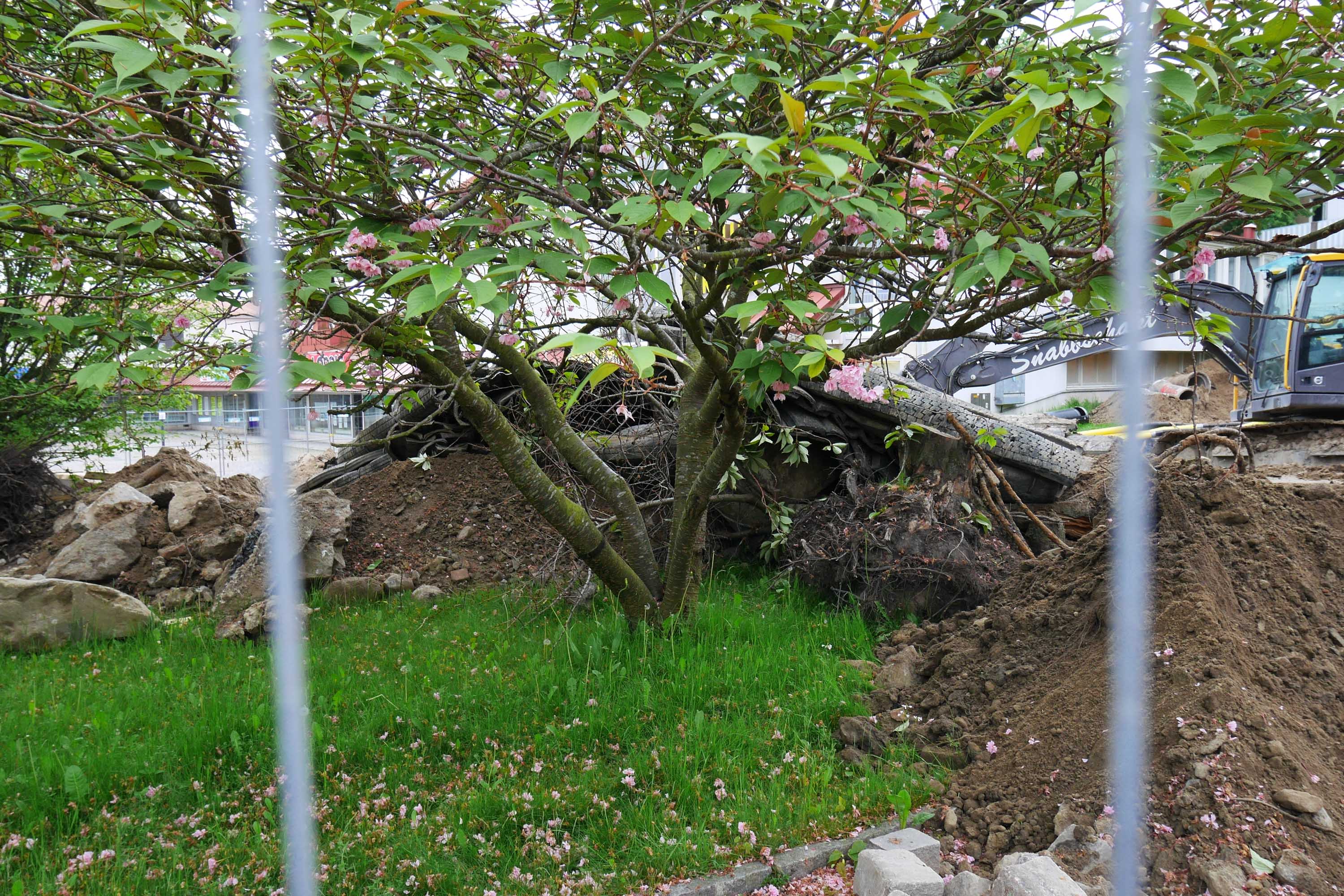 Ett av de japanska körsbärsträden, som blommade så vackert i våras, är nu så förstört av grävmaskinerna att det löper stor risk att dö under vintern. Någon hänsyn till trädrötter har inte heller tagits vid schaktningarna. Så här säger riktlinjerna i Trädpolicyn: