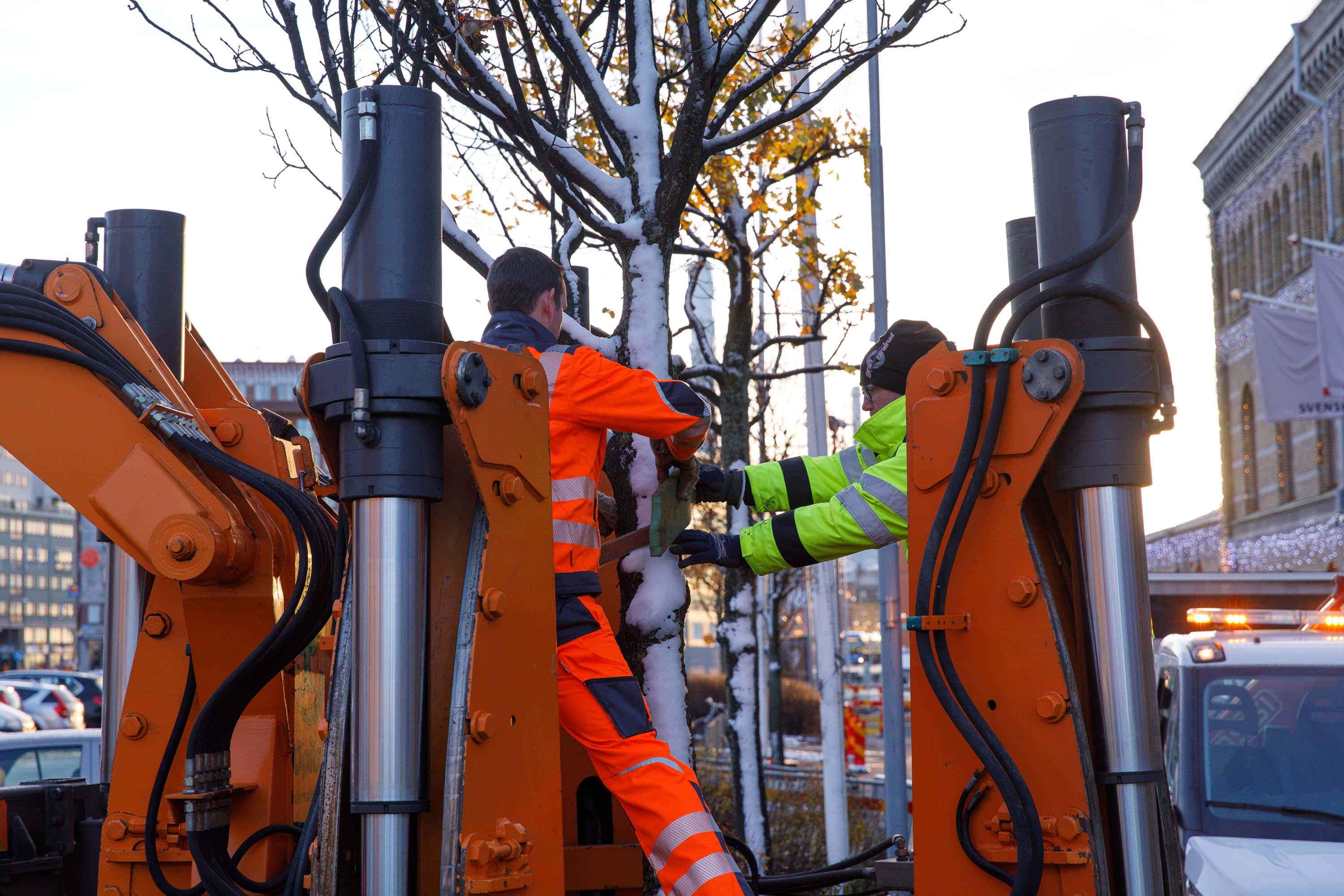 Träd lyfts under Västlänkens trädflytt. 21 november 2017. Foto: Chris Ceder