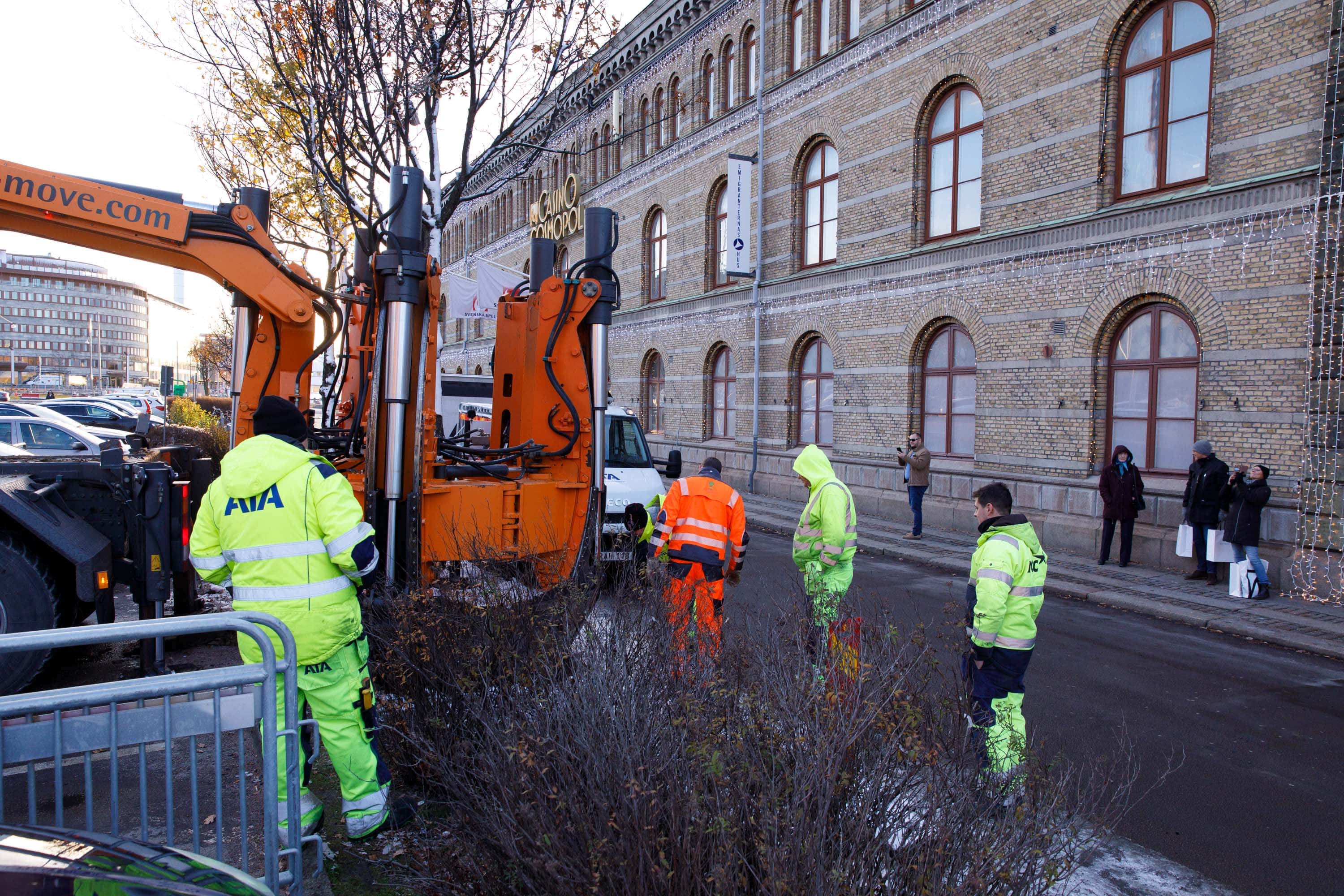 Förbipasserande stannar och tittar på träd som flyttas i Göteborg. 21 november 2017. Foto: Chris Ceder