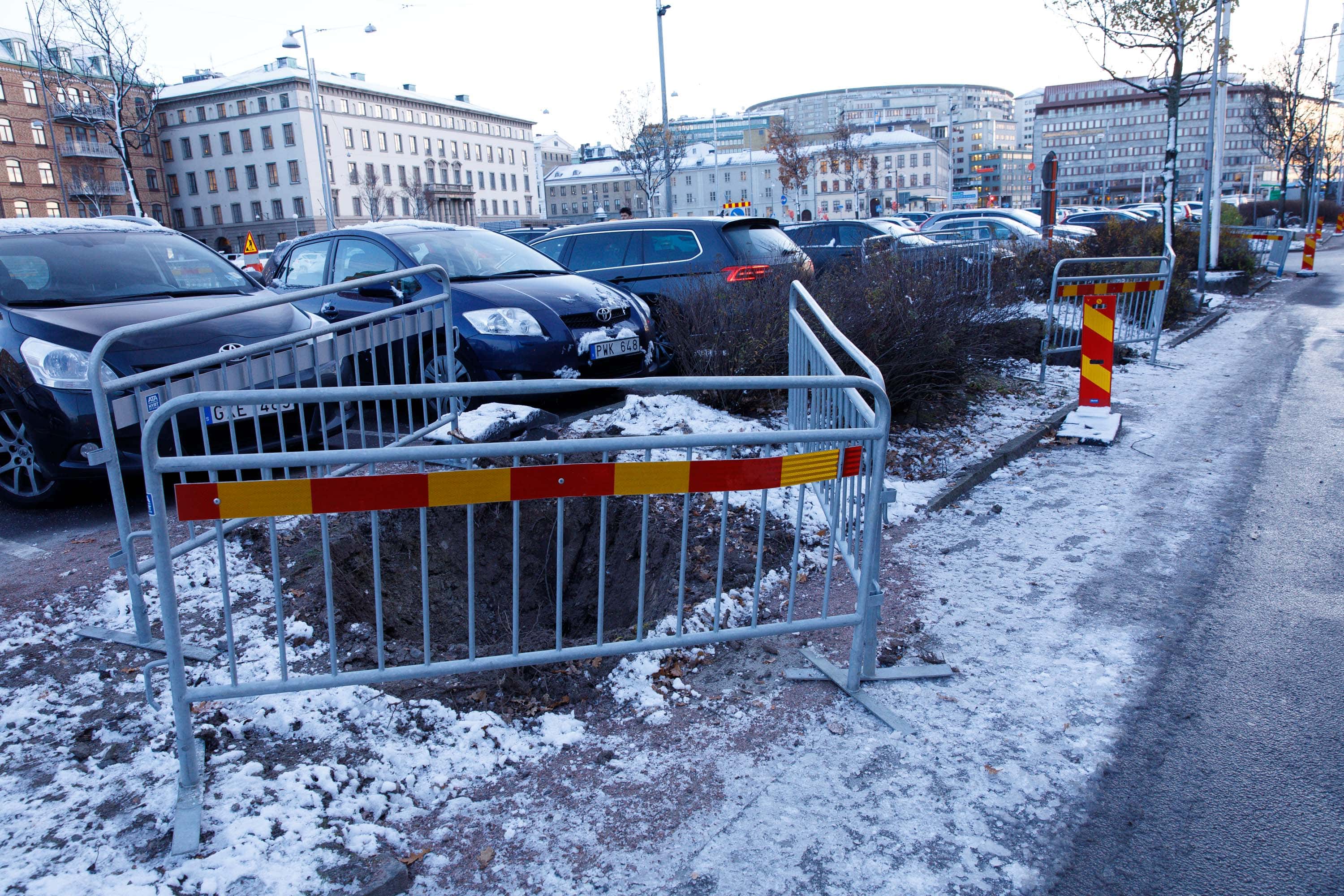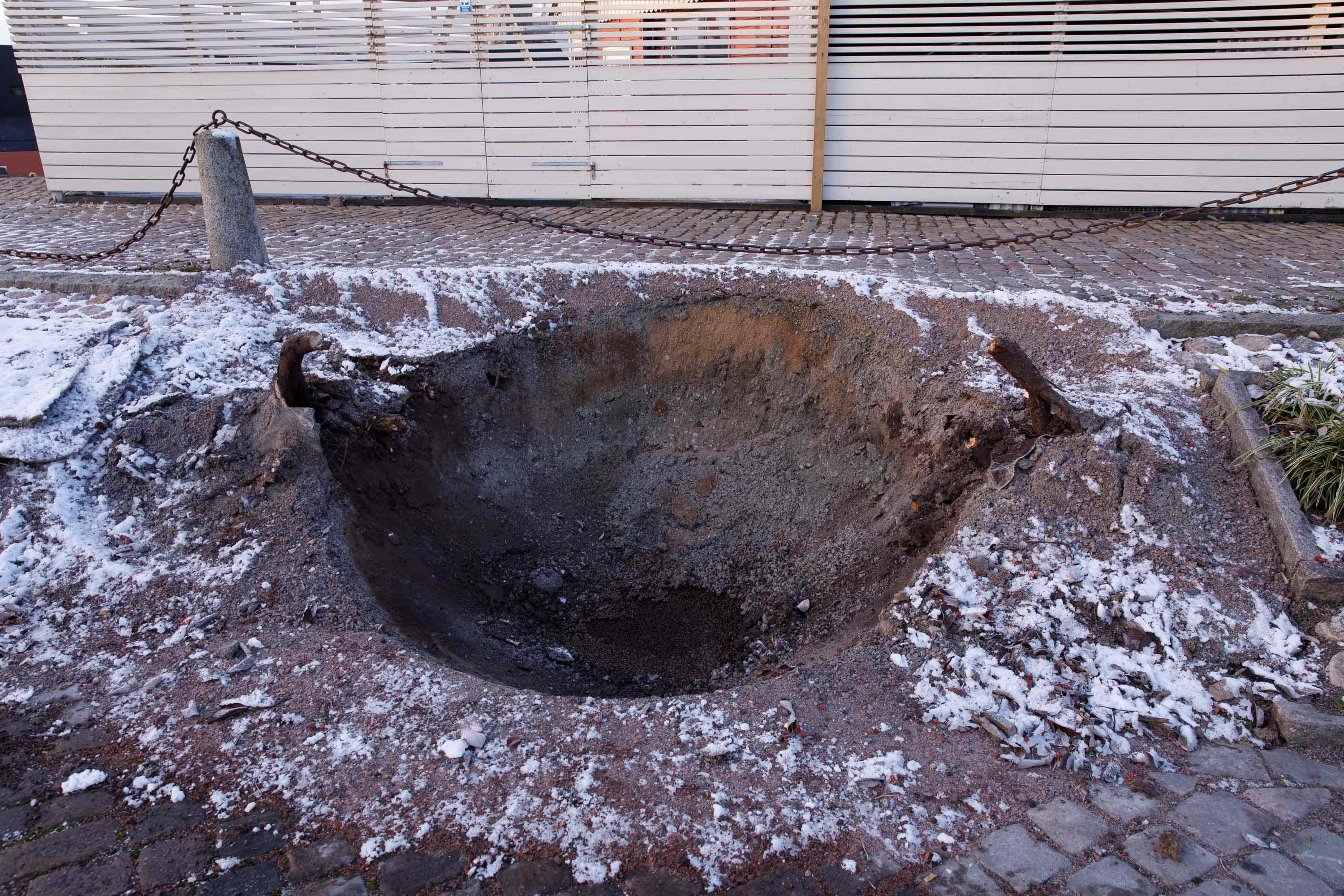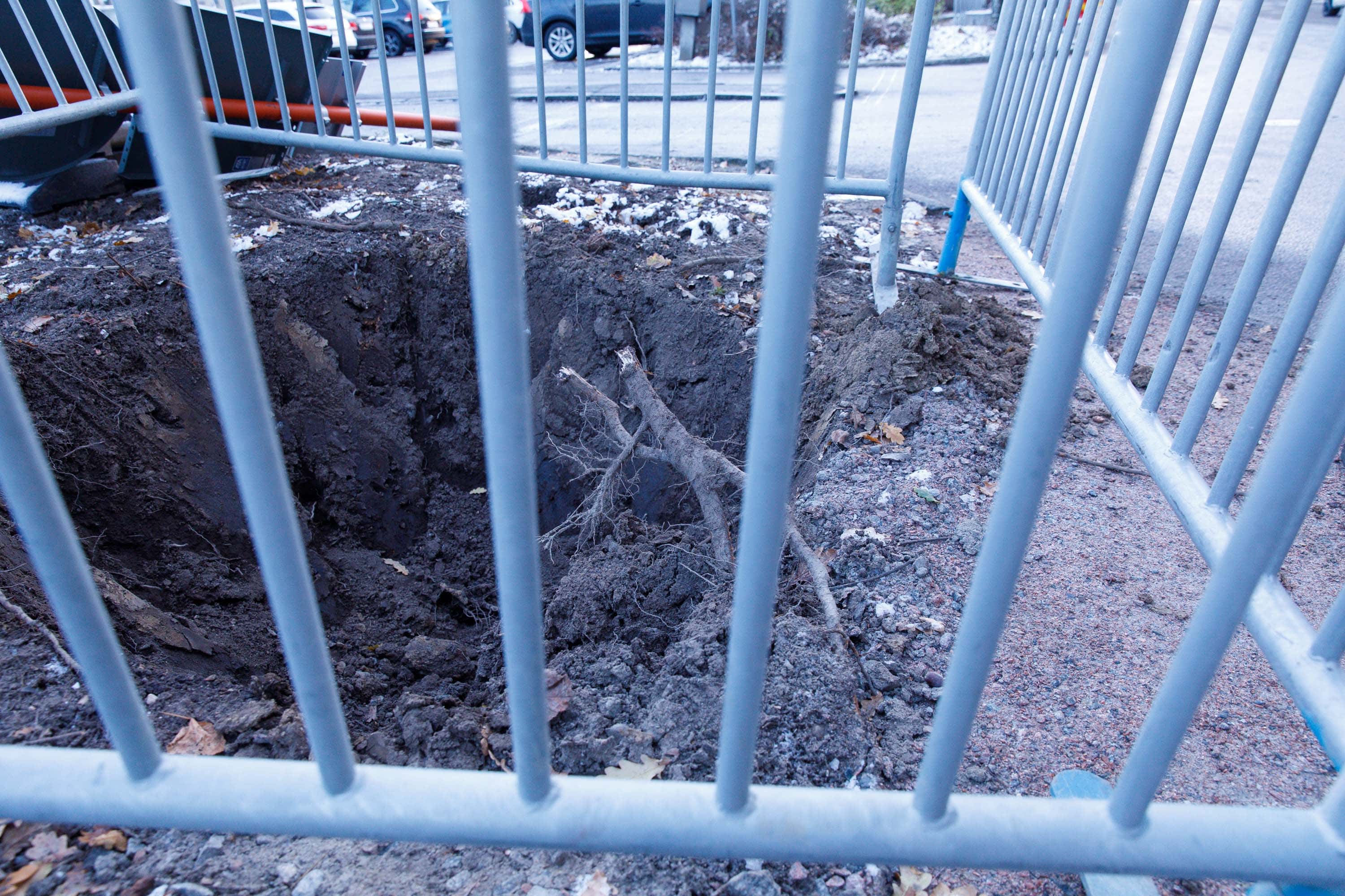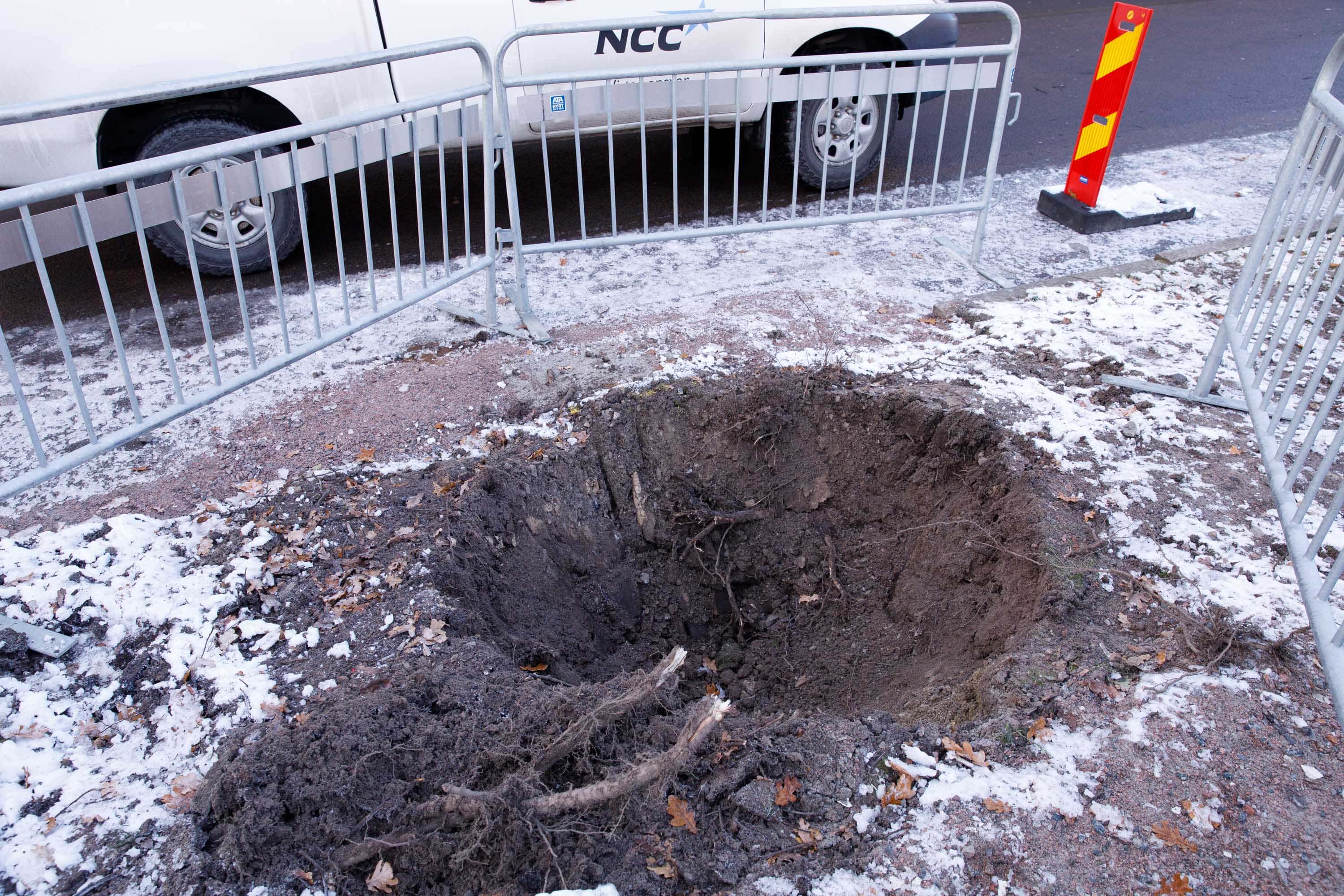 Hål efter bortgrävt träd i samband med Västlänken i Göteborg. 21 november 2017. Foto: Chris Ceder