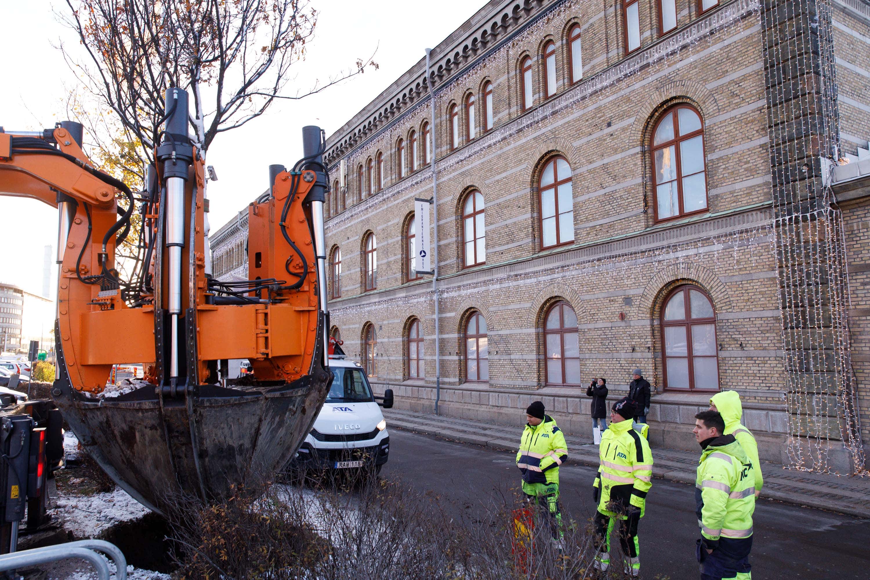 Träd flyttas under det tjuvstartade bygget Västlänken. 21 november 2017. Foto: Chris Ceder