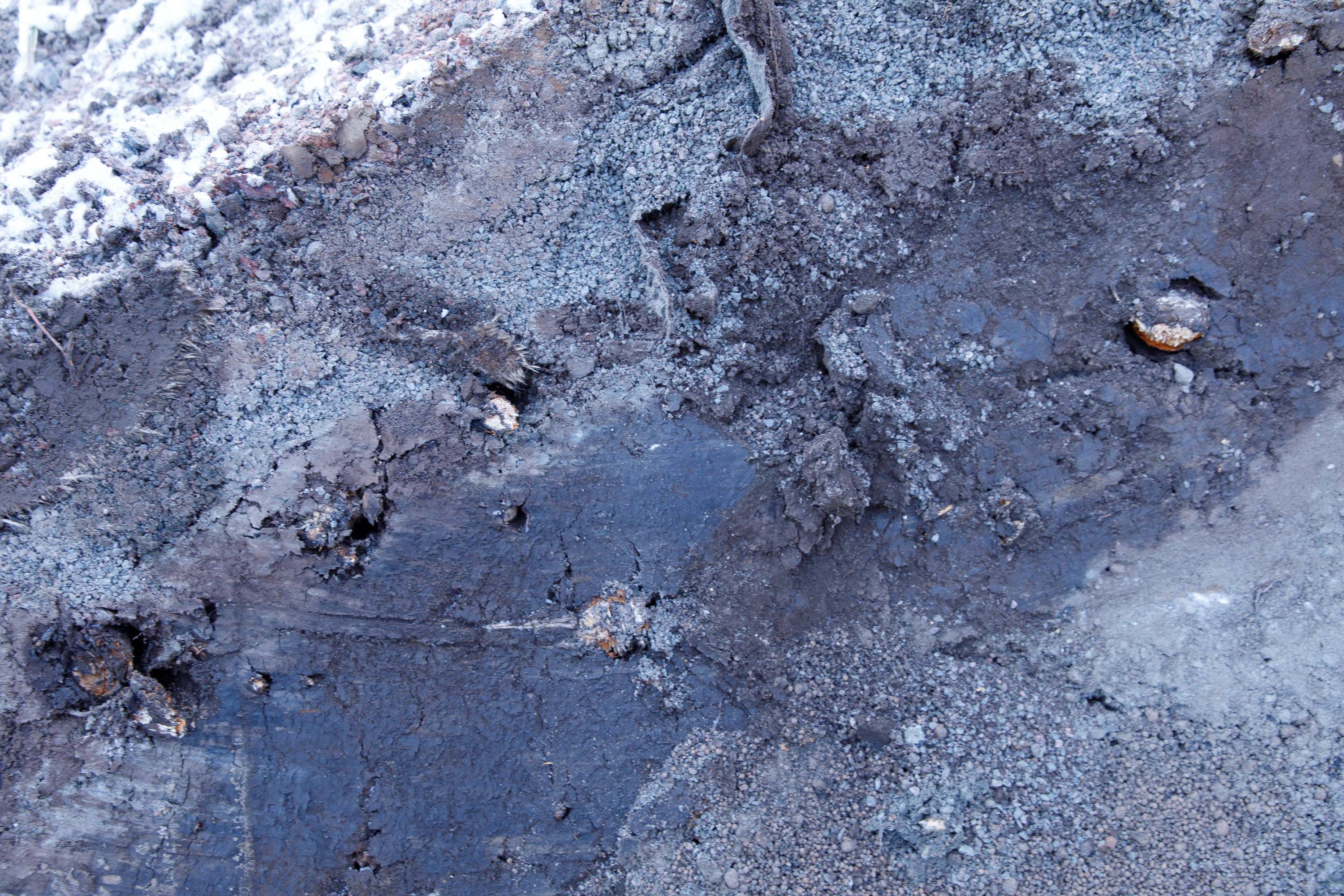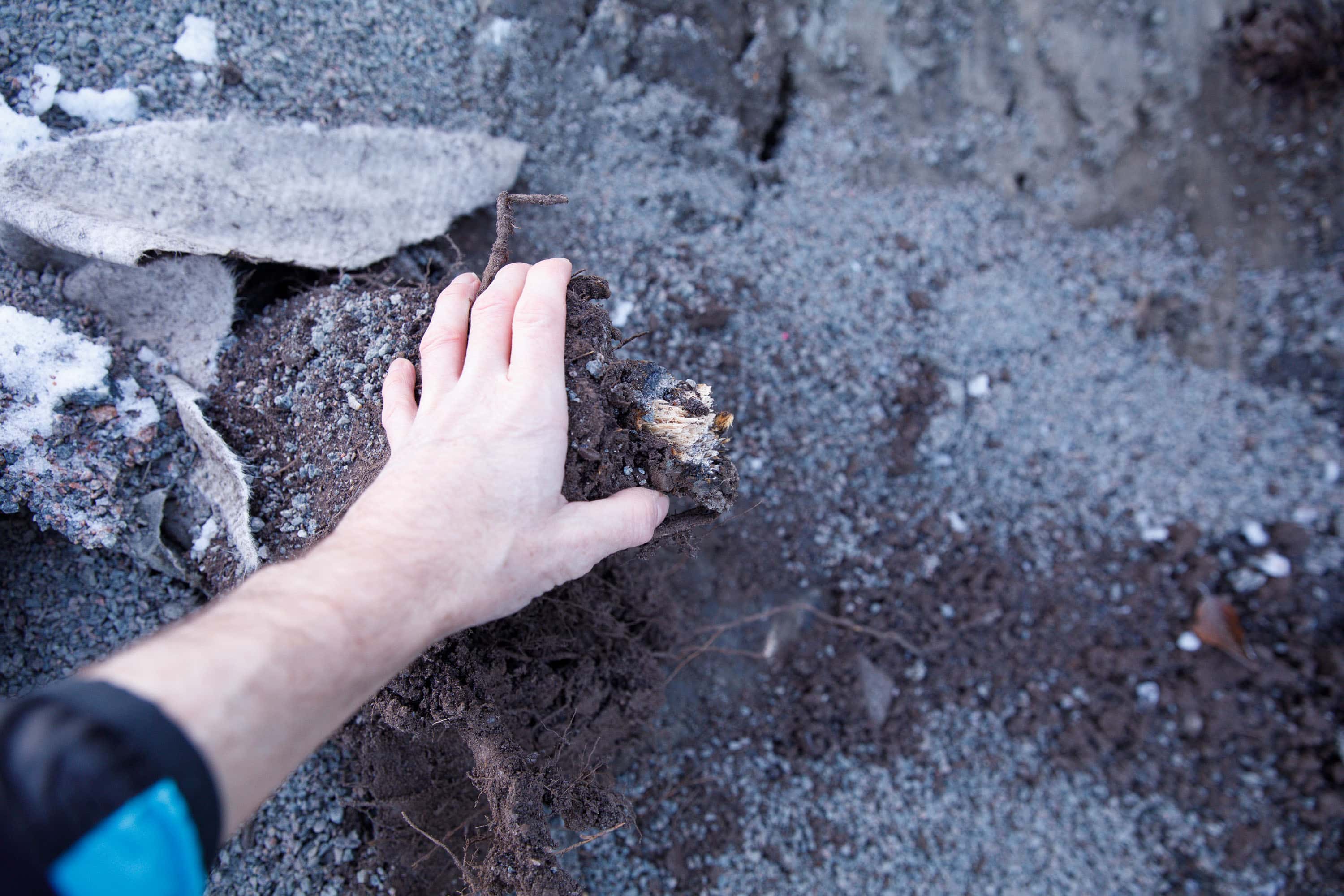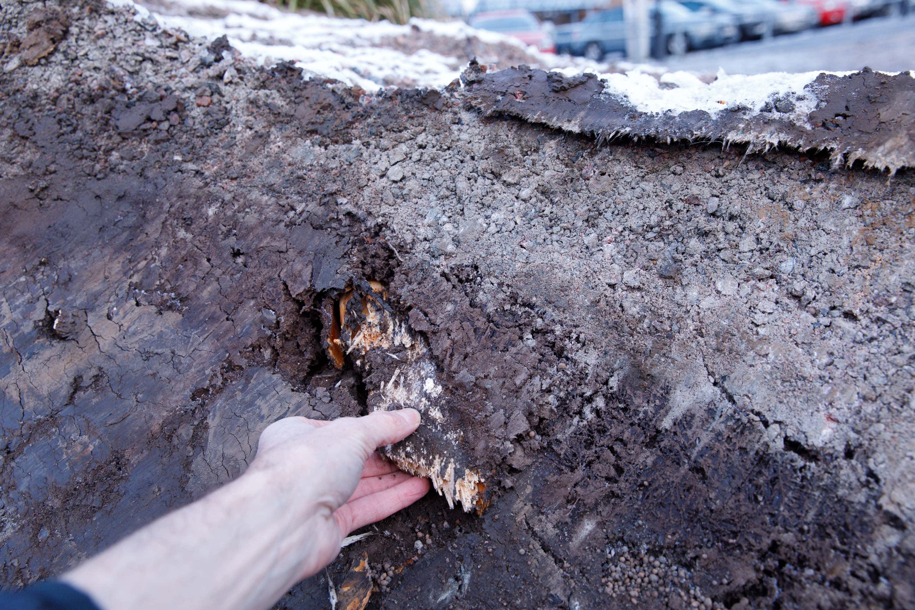 Decimetertjocka rötter i hål efter bortgrävt träd i samband med Västlänken i Göteborg. 21 november 2017. Foto: Chris Ceder