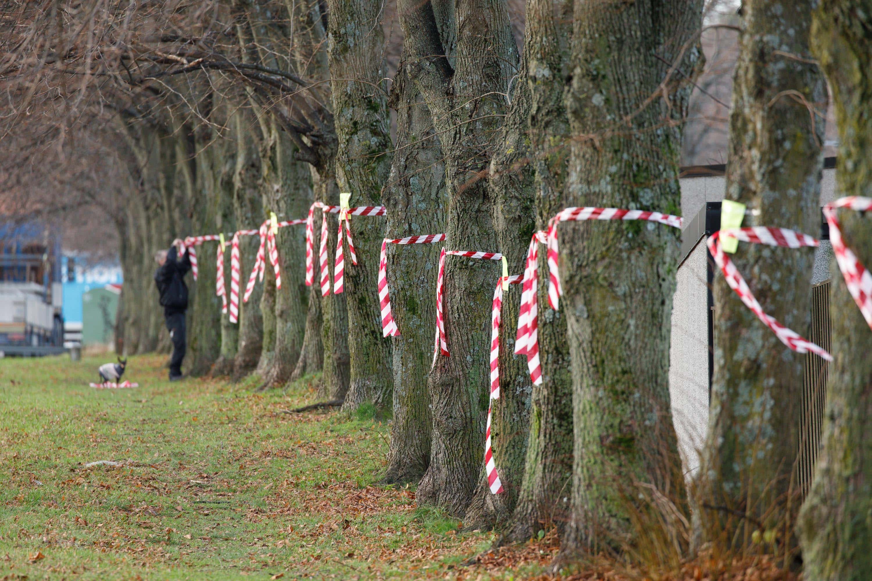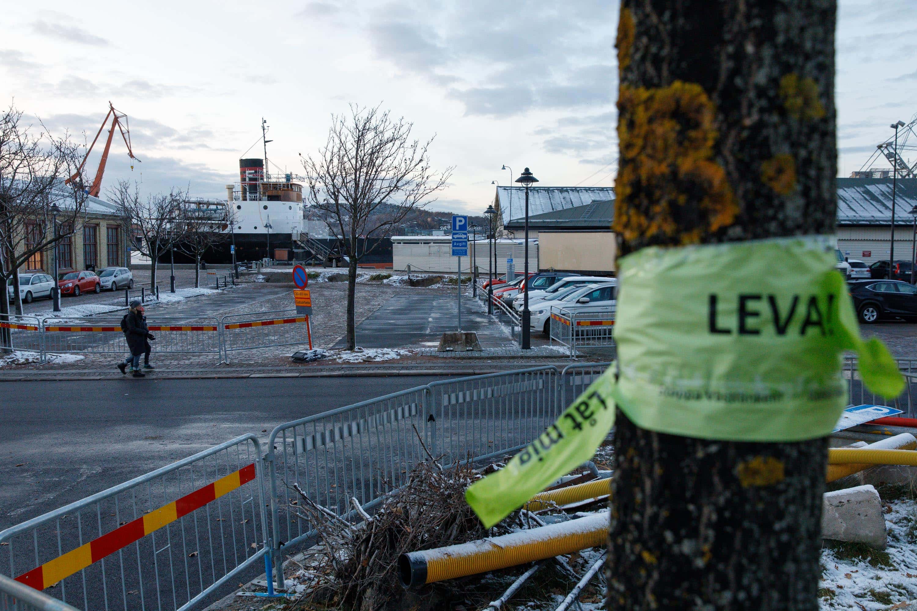 “Låt mig leva – Stoppa Västlänen Rädda Miljön” står det på lappar på träden som ännu står kvar under den pågående trädflytten under Västlänken. Foto: Chris Ceder