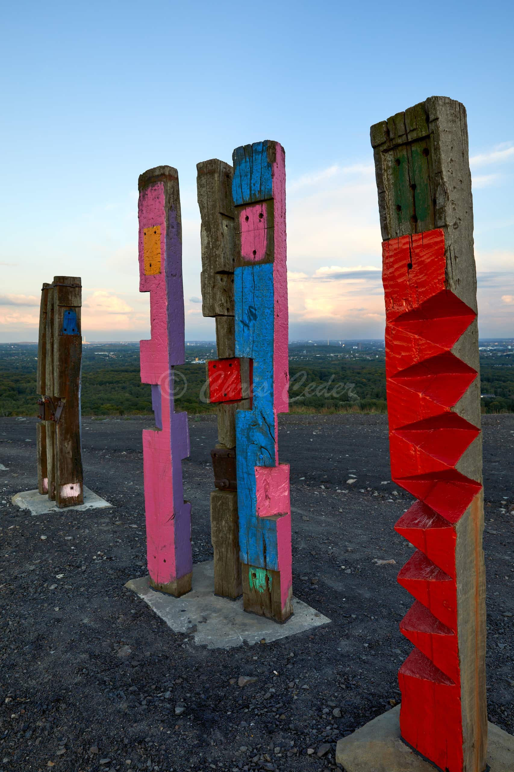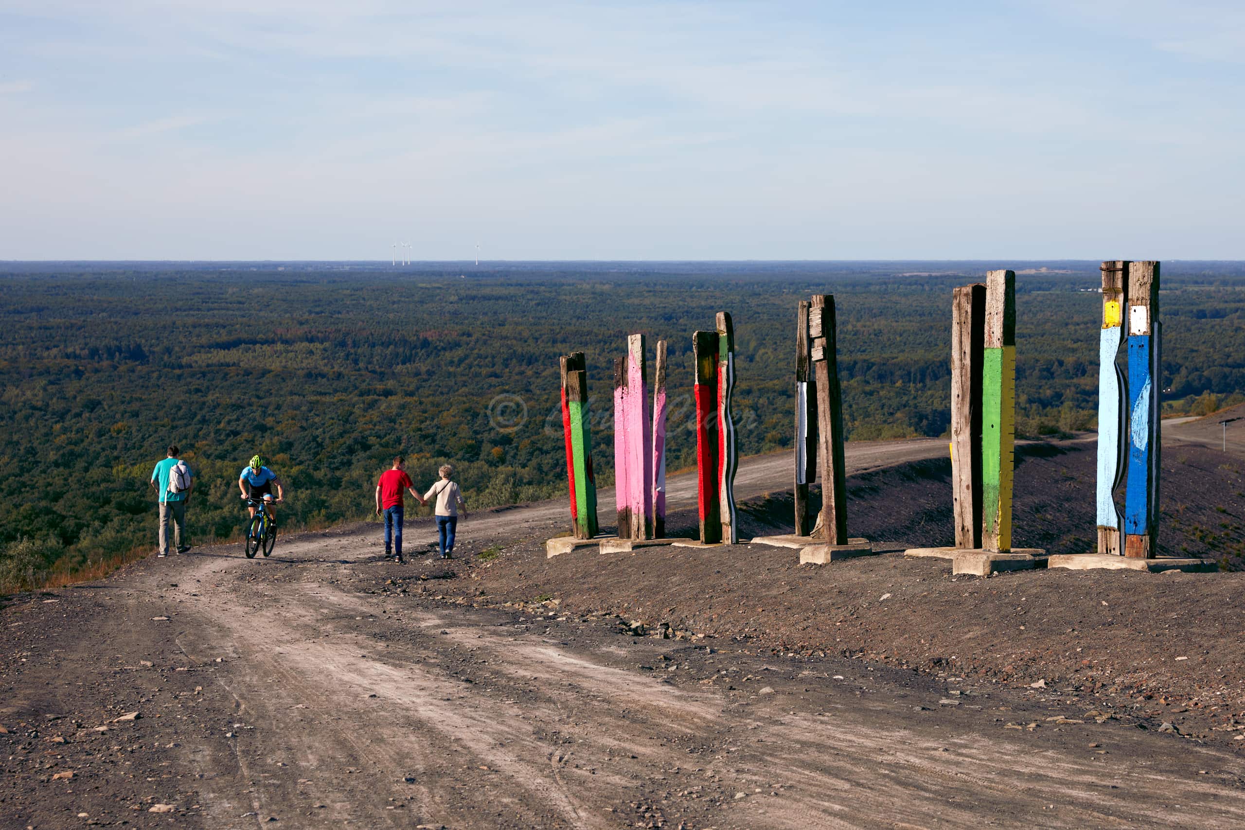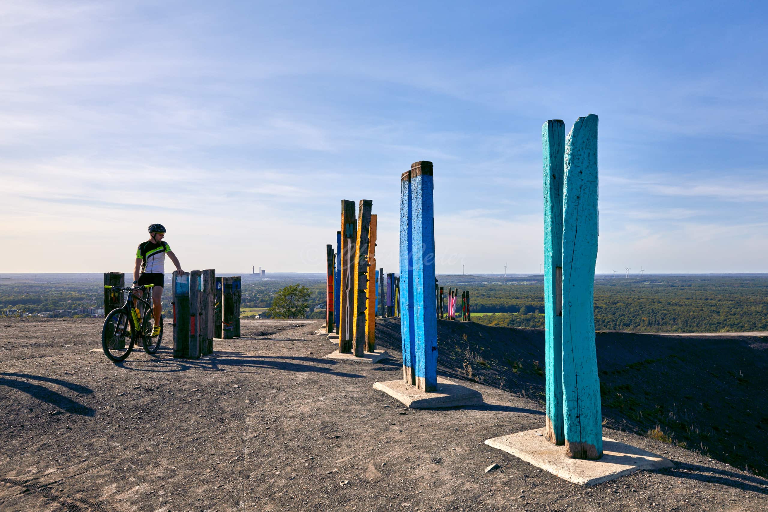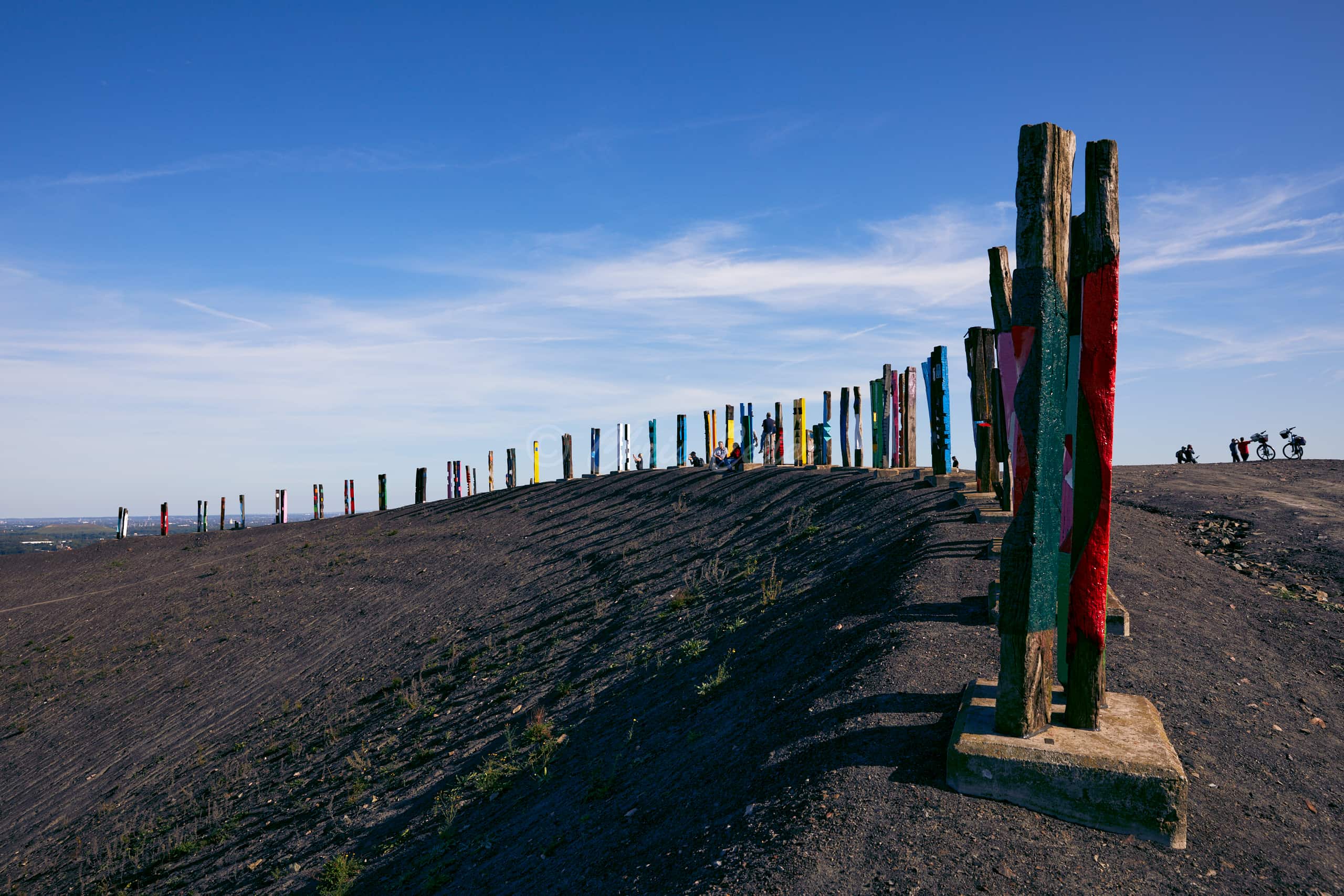 At 159 meters elevation, Halde Haniel is the highest accessible coal slag heap in the Ruhr area. At the summit there is a totem sculpture park and below an open air chapel with a large cross and an amphitheater.