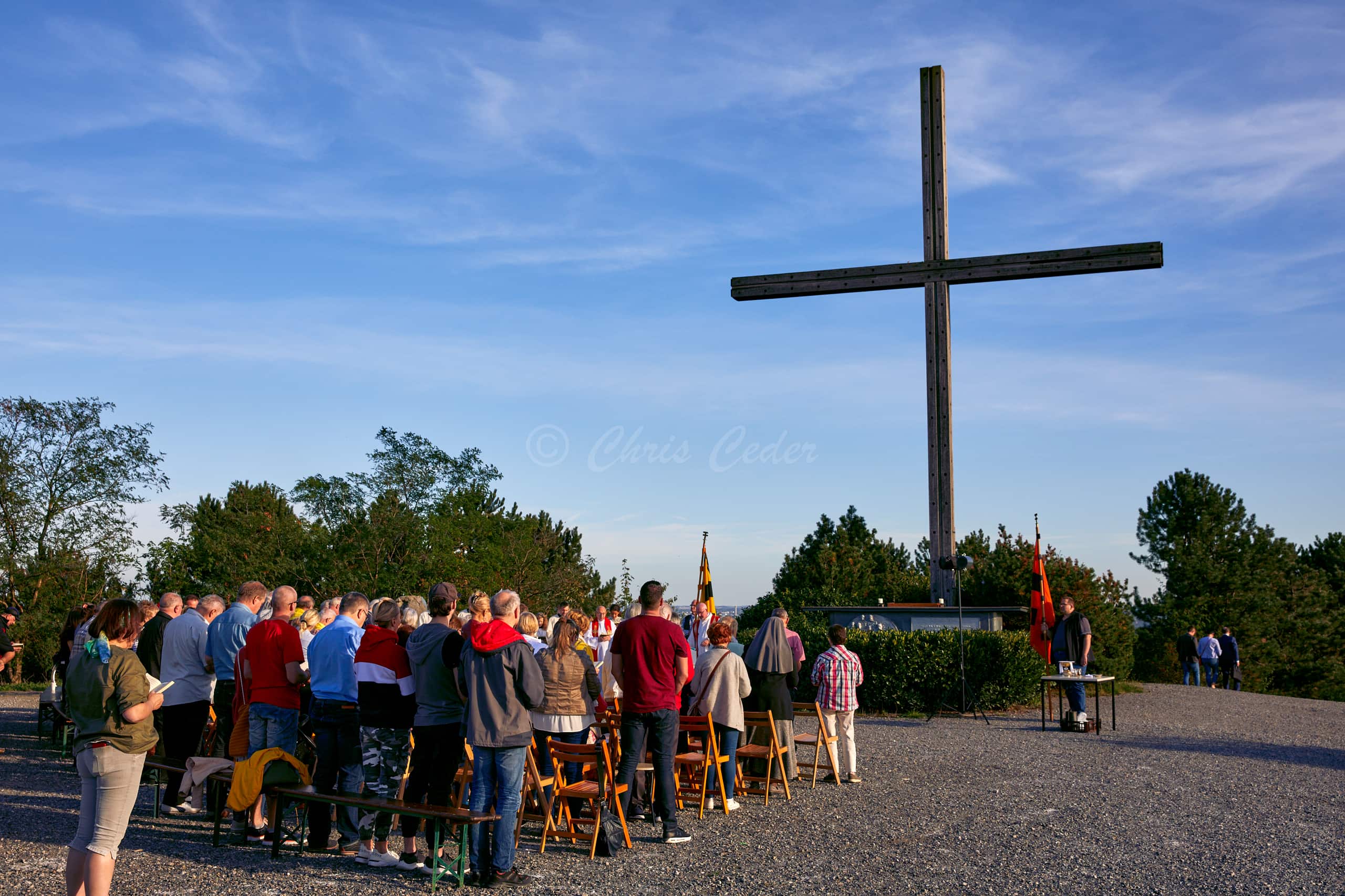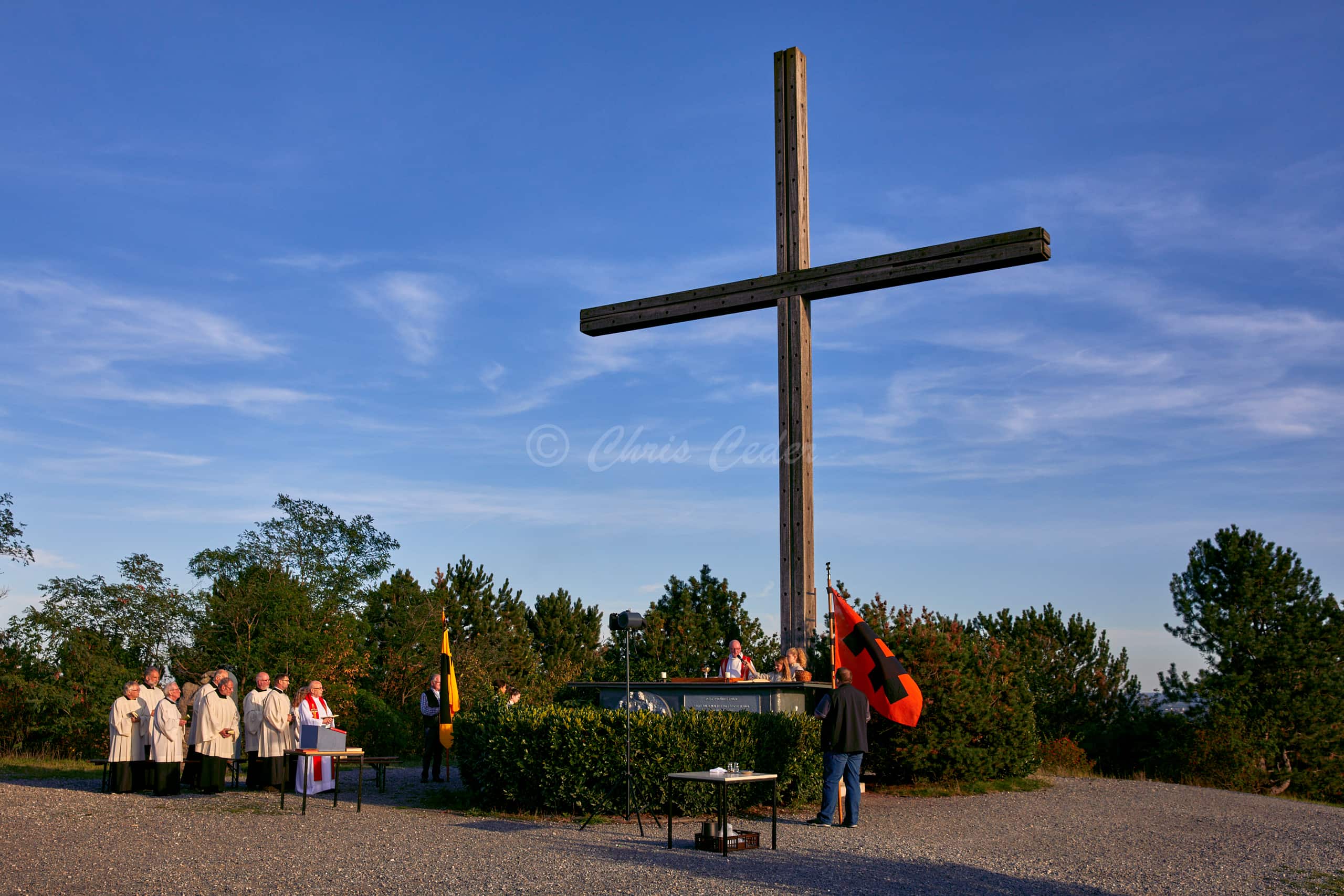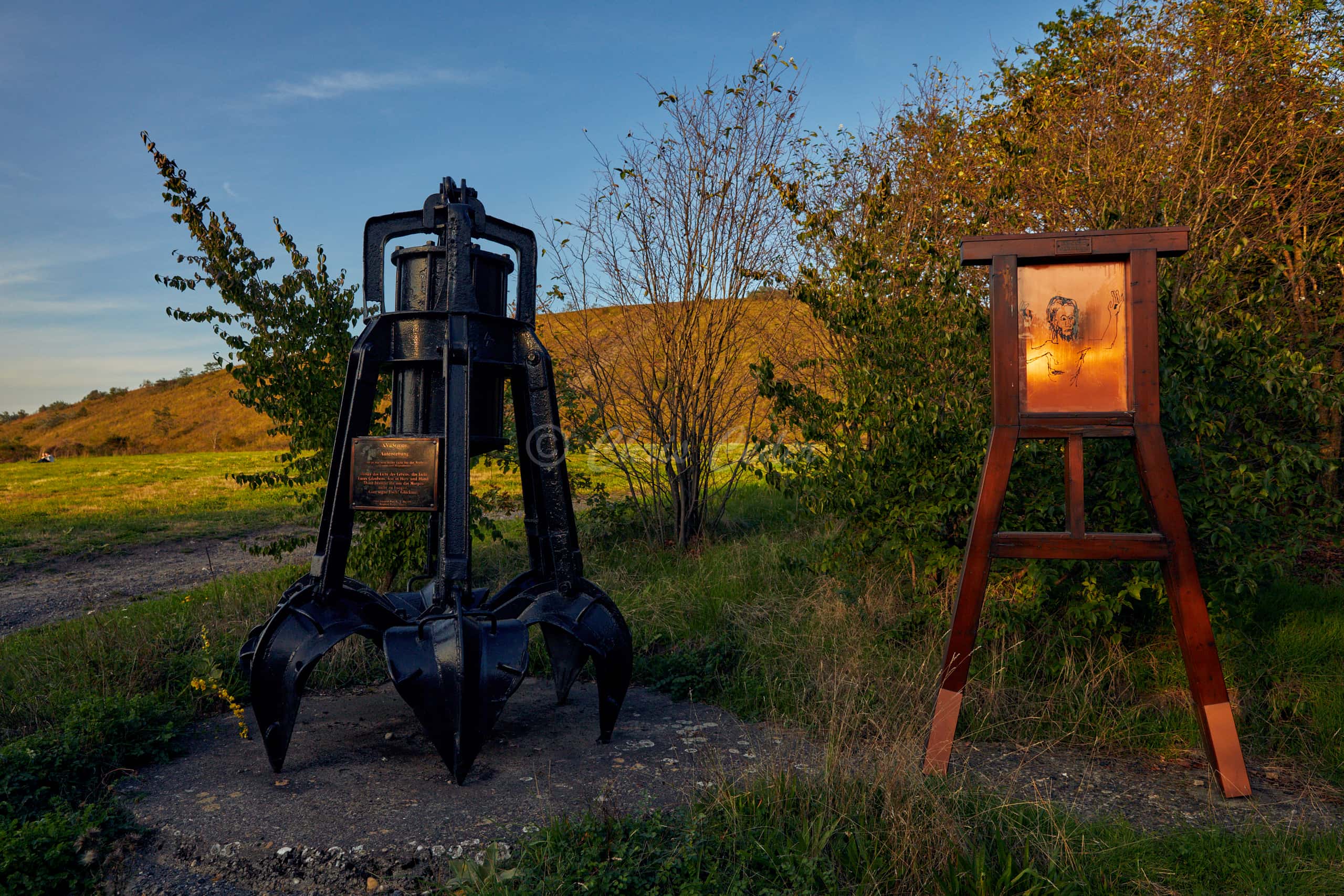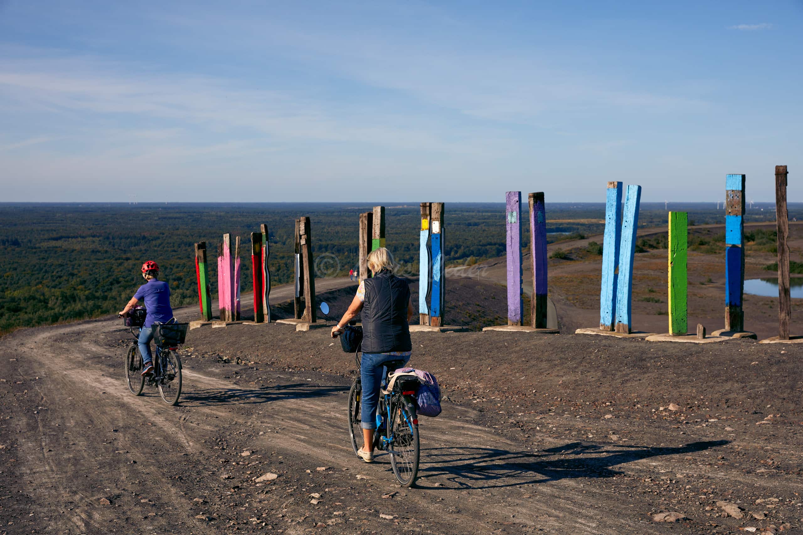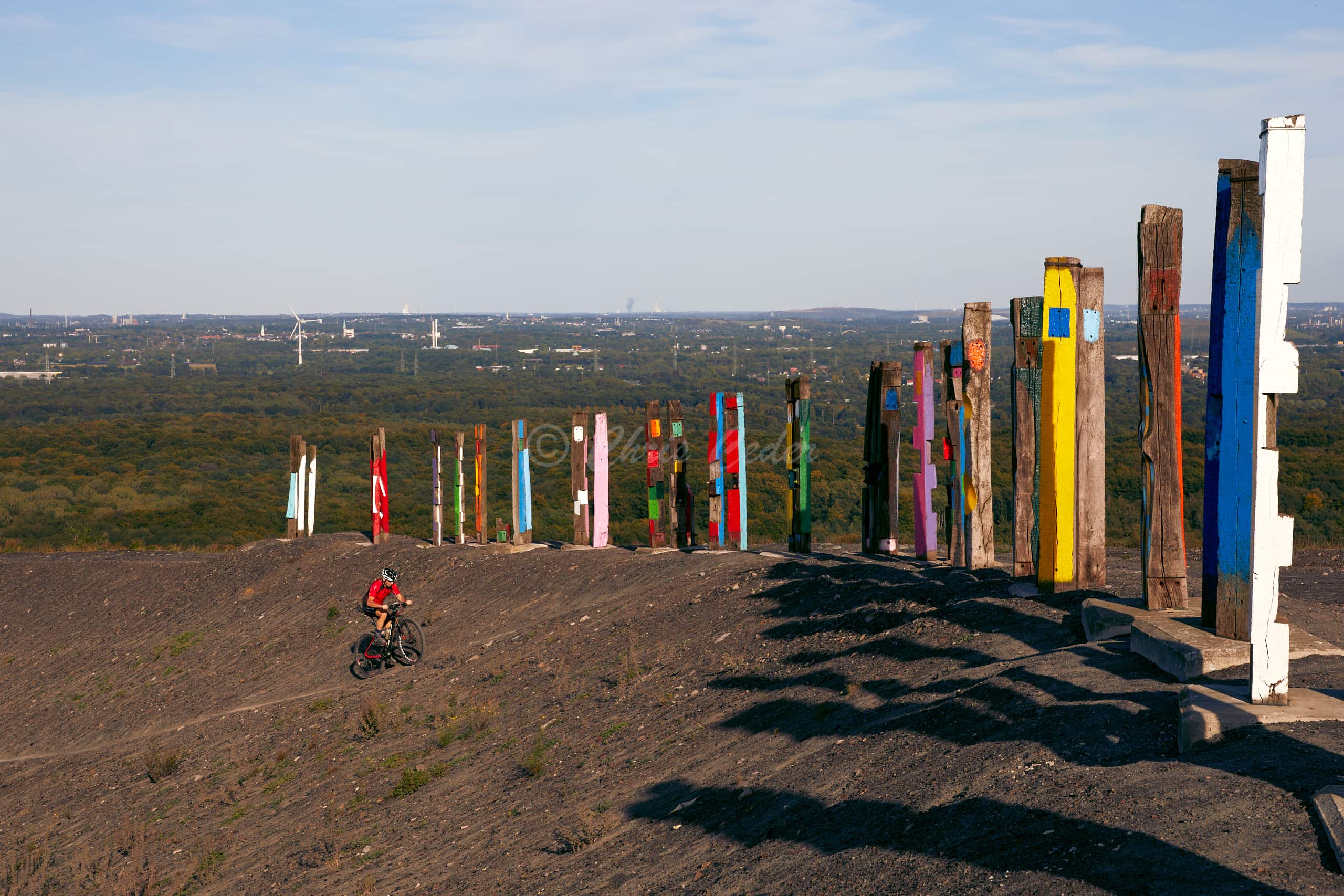 At 159 meters elevation, Halde Haniel is the highest accessible coal slag heap in the Ruhr area. At the summit there is a totem sculpture park and below an open air chapel with a large cross and an amphitheater.