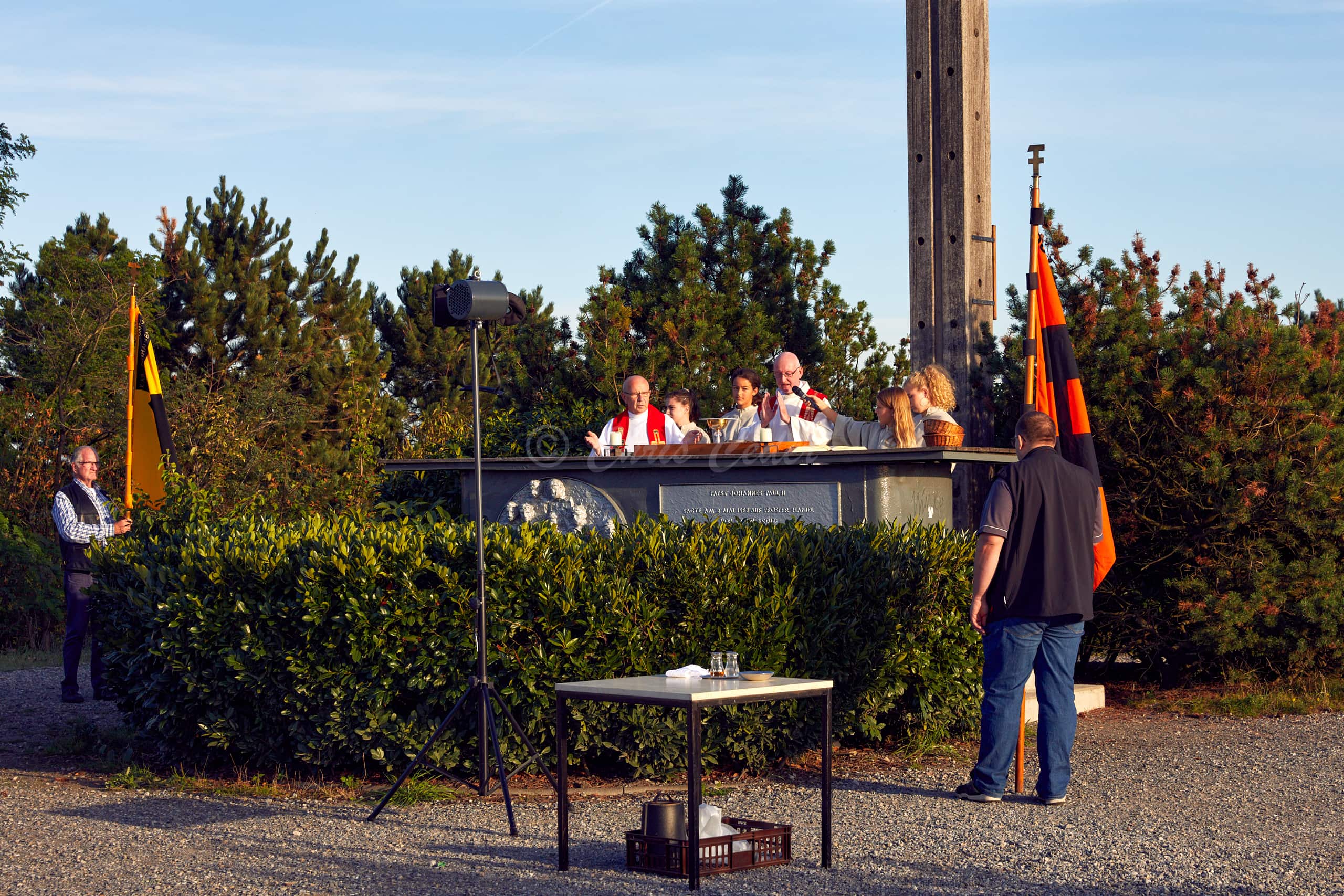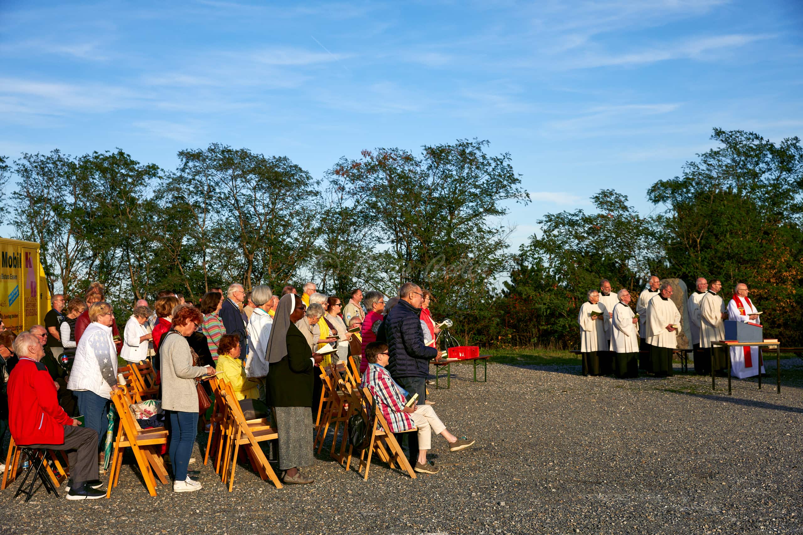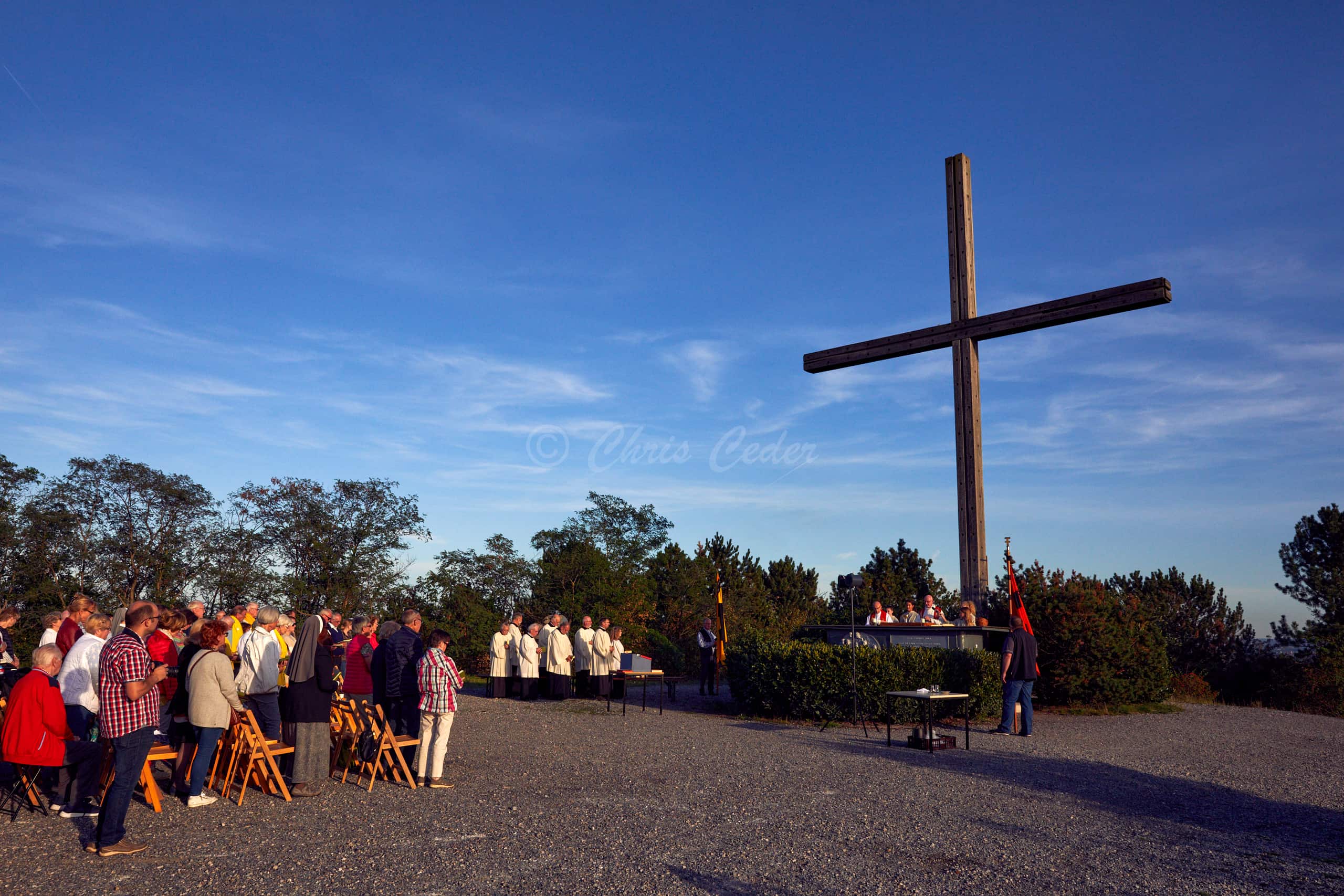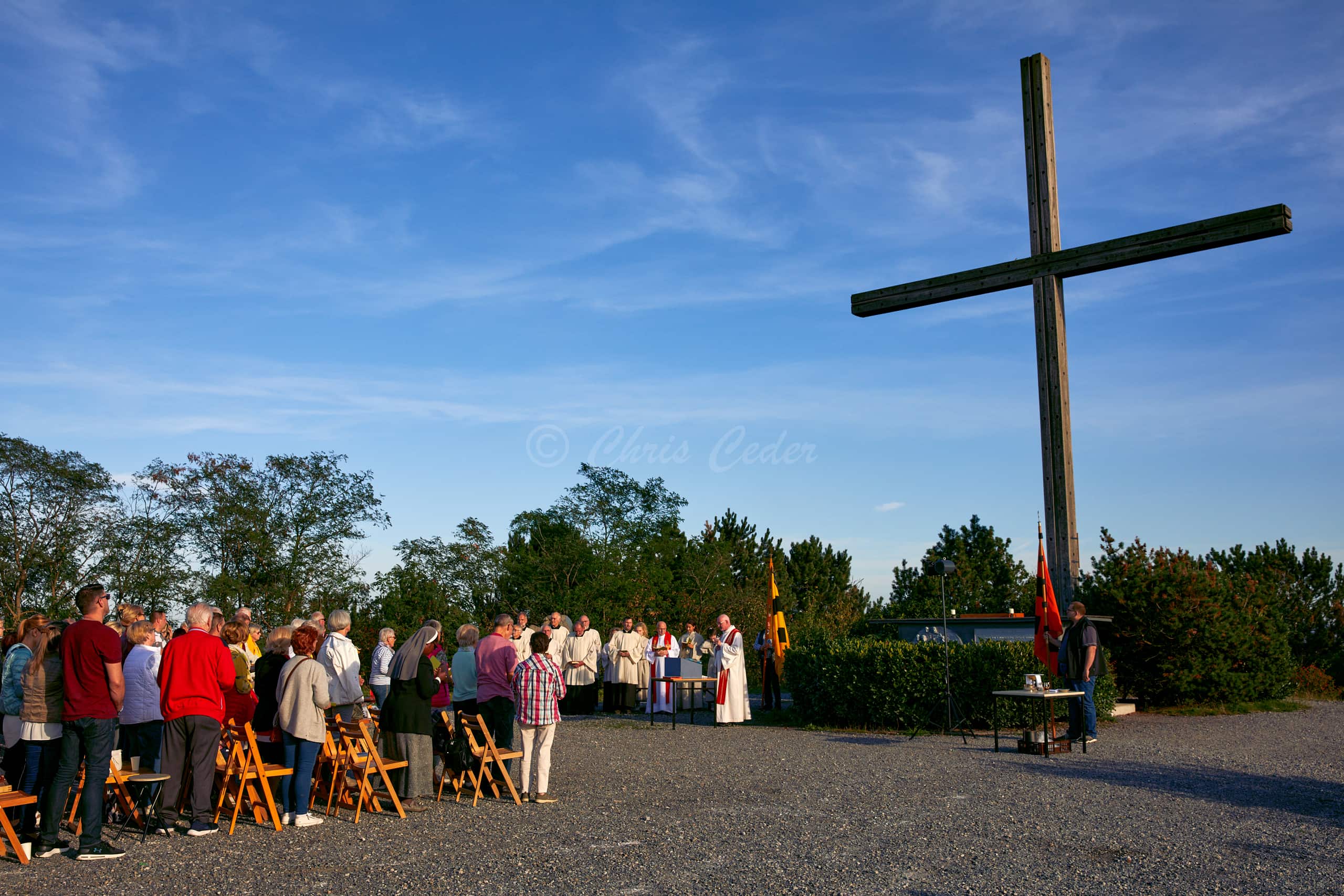 At 159 meters elevation, Halde Haniel is the highest accessible coal slag heap in the Ruhr area. At the summit there is a totem sculpture park and below an open air chapel with a large cross and an amphitheater.