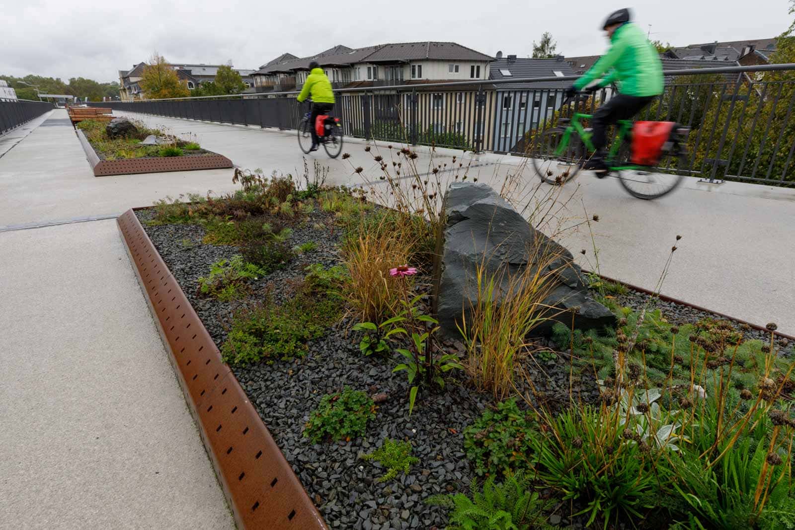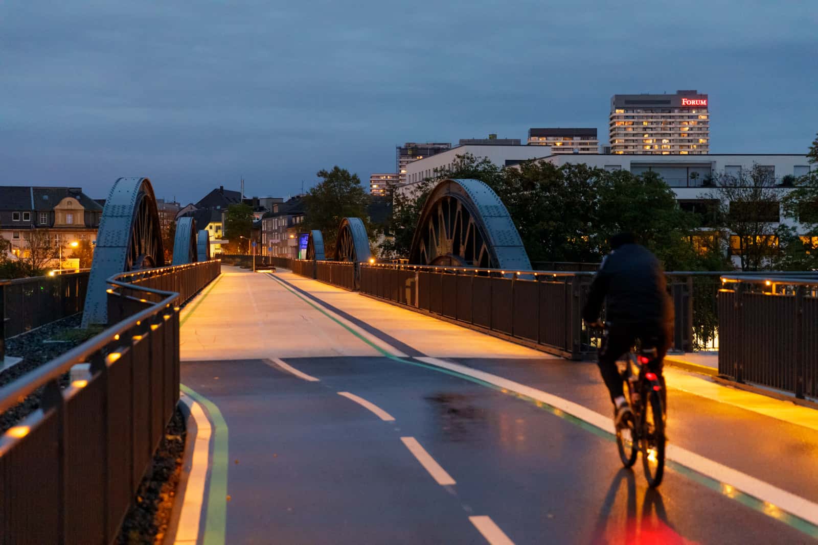 Cykelmotorvägen RS1 går över en kilometerlång gammal järnvägsviadukt genom Mülheims centrum
