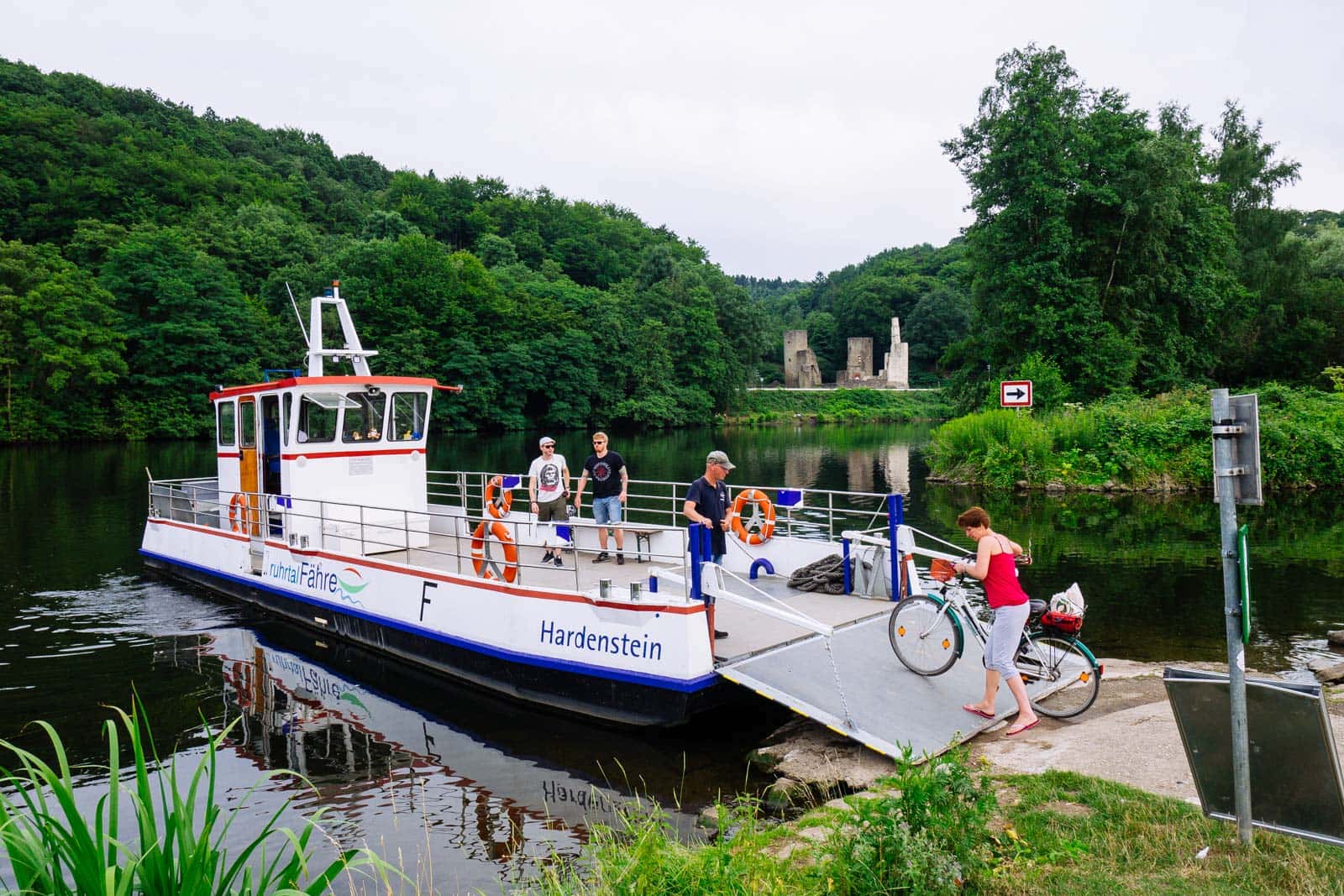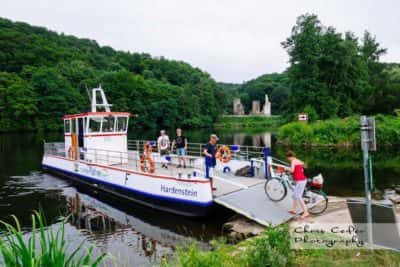 Cykelfärjan över floden Ruhr vid den medeltida borgruinen Hardenstein i Witten, en av mängder av sevärdheter på Ruhrtal Radweg.