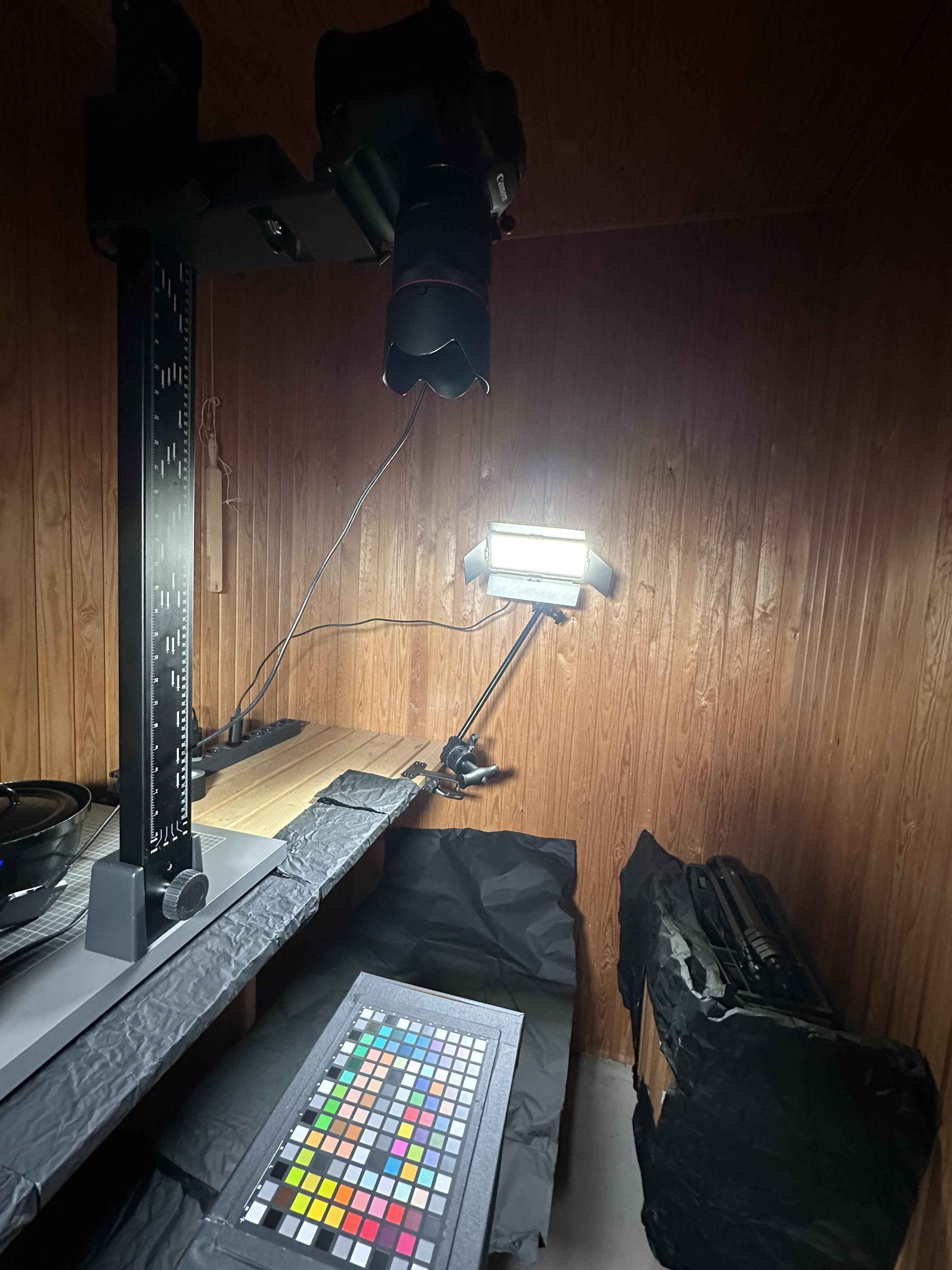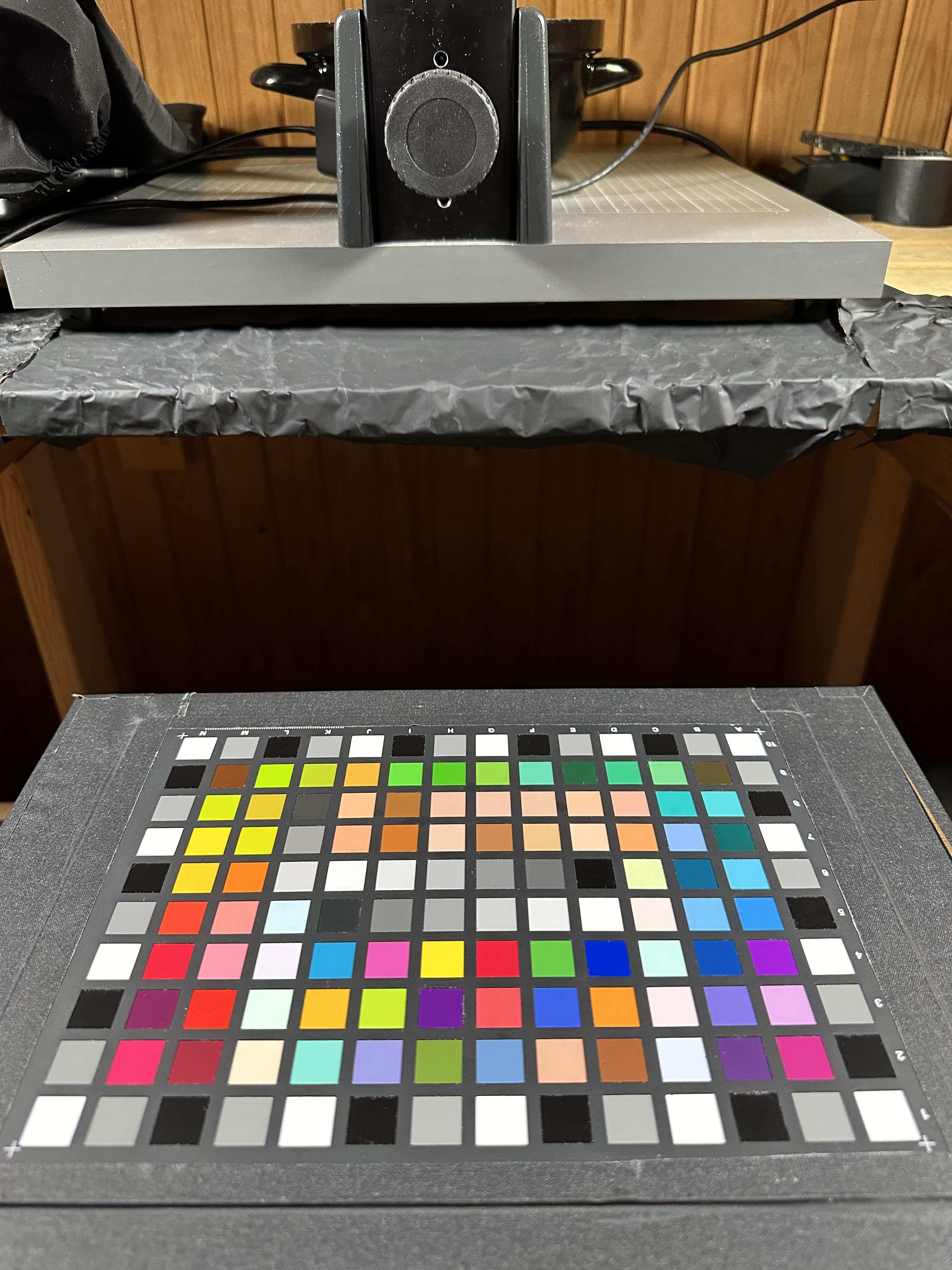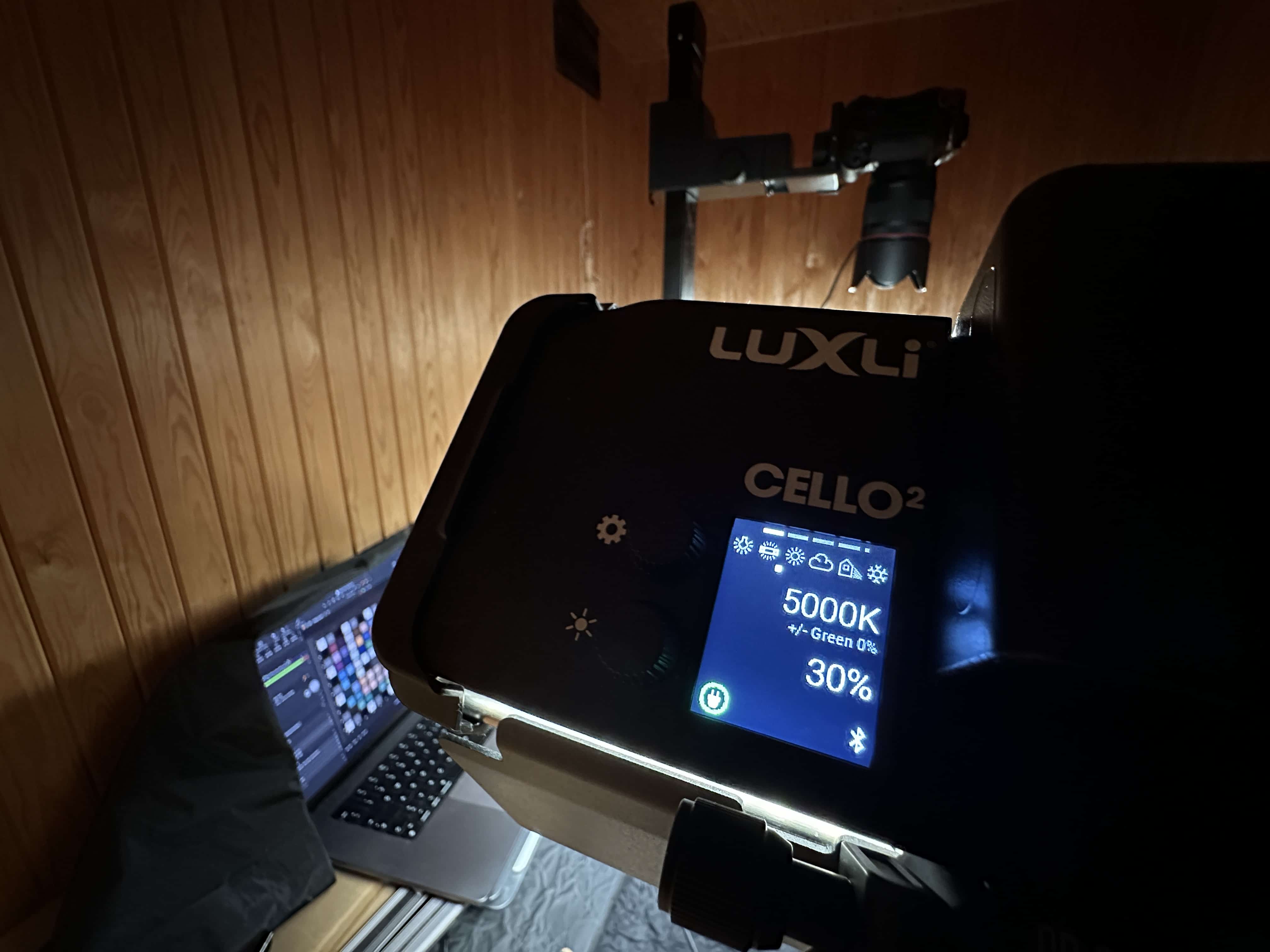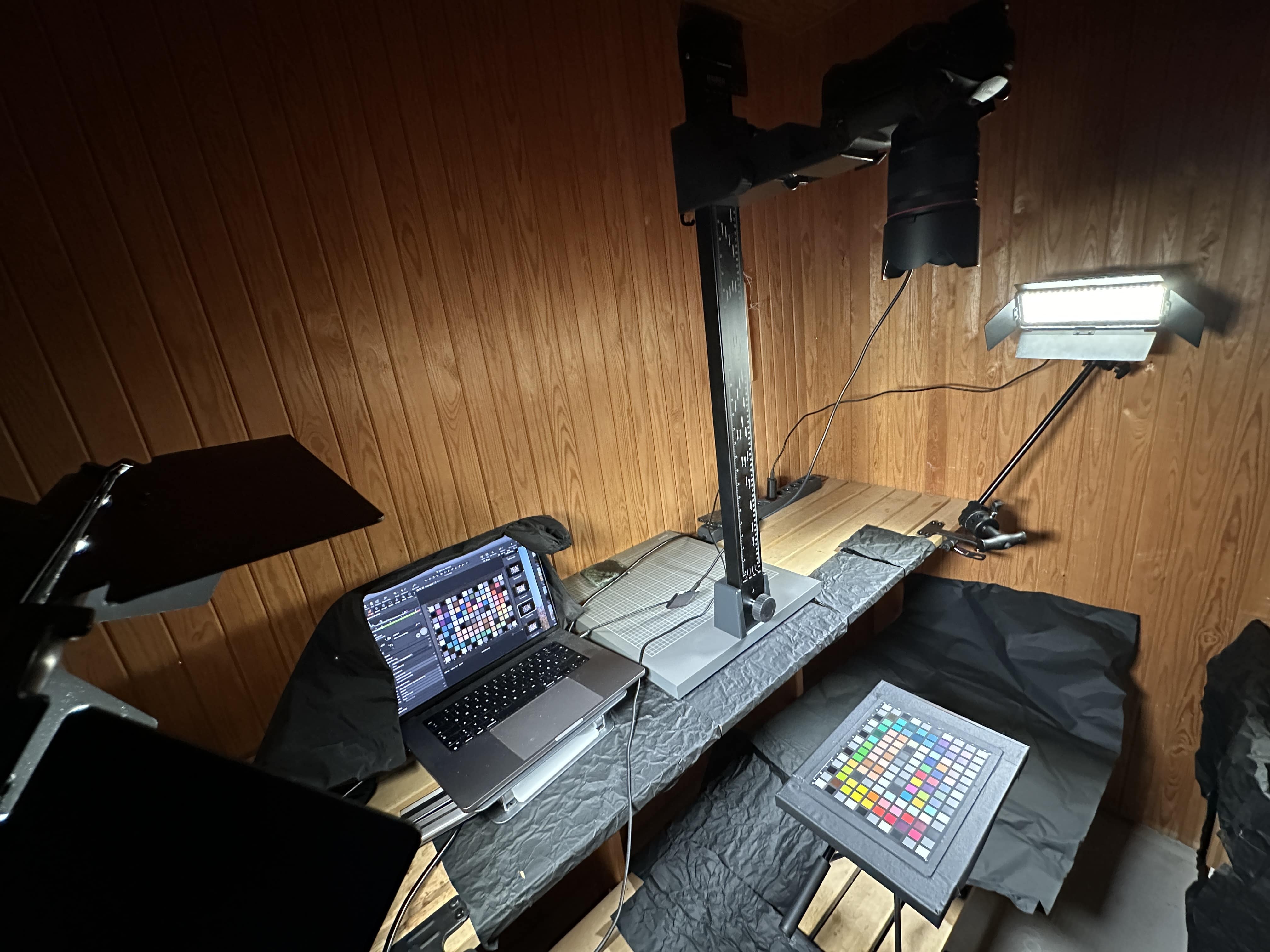 My Camera Portrait Tungsten and Indoor profile is made in a completely dark studio setting, where I photograph the Calibrate colorchecker Digital illuminated by state of the art Luxli Cello² lights. Two lights are placed at exactly the same distance and angle on either side of the colorchecker, with the camera mounted above on a rock-solid Kaiser copy stand. This setup provides a totally even illumination of the colorchecker, which is necessary for an optimal capture of the image to make the camera profile. The Luxli Cello² lights output 1490 lux at a distance of 3 feet and have a TLCI of 98 and CRI of 96, ensuring optimal color reproduction in artificial light conditions.